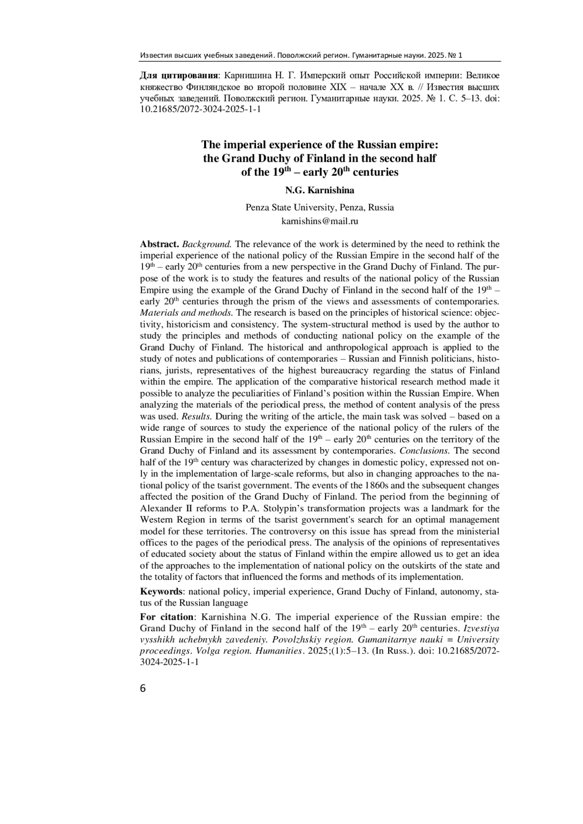 Актуальность и цели. Актуальность работы определяется необходимостью с новых позиций переосмыслить имперский опыт проведения национальной политики Российской империи во второй половине XIX - начале XX в. в Великом княжестве Финляндском. Цель исследования - изучить особенности и результаты проведения национальной политики Российской империи на примере Великого княжества Финляндского во второй половине XIX - начале XX в. через призму взглядов и оценок современников. Материалы и методы. Исследование проведено на базе принципов исторической науки: объективности, историзма и системности. Системно-структурный метод использован автором для изучения принципов и методов проведения национальной политики на примере Великого княжества Финляндского. Историко-антропологический подход применен при изучении записок и публикаций современников - российских и финских политиков, историков, правоведов, представителей высшей бюрократии по поводу статуса Финляндии в составе империи. Применение сравнительно-исторического метода исследования позволило проанализировать особенности положения Финляндии в составе Российской империи. При анализе материалов периодической печати был использован метод контент-анализа прессы. Результаты. Решена основная задача - на основе широкого комплекса источников изучить опыт проведения национальной политики правителей Российской империи второй половины XIX - начала XX в. на территории Великого княжества Финляндского и его оценку современниками. Выводы. Вторая половина XIX в. характеризовалась изменениями во внутренней политике, выразившихся не только в проведении широкомасштабных реформ, но и в изменении подходов к национальной политике царского правительства. События 1860-х гг. и последовавшие за ними изменения коснулись и положения Великого княжества Финляндского. Период от начала реформ Александра II до проектов преобразований П. А. Столыпина был знаковым для Западного края в плане поиска царским правительством оптимальной модели управления этими территориями. Полемика по этому вопросу вышла из министерских кабинетов на страницы периодической печати. Анализ мнений представителей образованного общества по поводу статуса Финляндии в составе империи позволил составить представление о подходах к реализации национальной политики на окраинах государства и совокупности факторов, влиявших на формы и методы ее проведения.