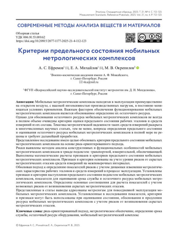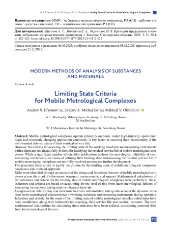Однако для обоснования остаточного ресурса мобильных метрологических комплексов не всегда в полном объеме очевидны критерии оценки предельного состояния рабочих эталонов и средств измерений из их состава. Тематика метрологической надежности таких средств измерений раскрыта в многочисленных научных статьях, тем не менее, вопросы определения предельного состояния и оценивания остаточного ресурса мобильных метрологических комплексов в полной мере не решены и требуют дальнейшей проработки.