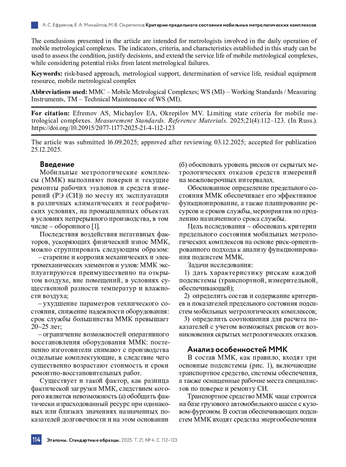 Мобильные метрологические комплексы (ММК) выполняют поверки и текущие ремонты рабочих эталонов и средств измерений (РЭ (СИ)) по месту их эксплуатации в различных климатических и географических условиях, на промышленных объектах в условиях непрерывного производства, в том числе – оборонного [1].