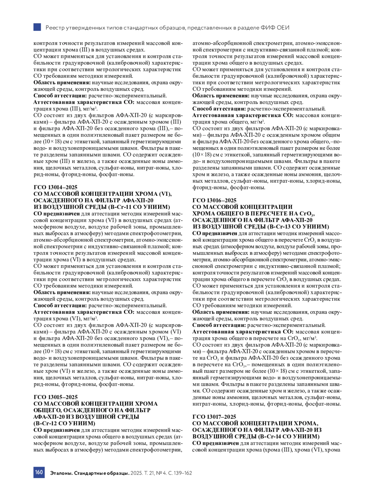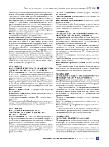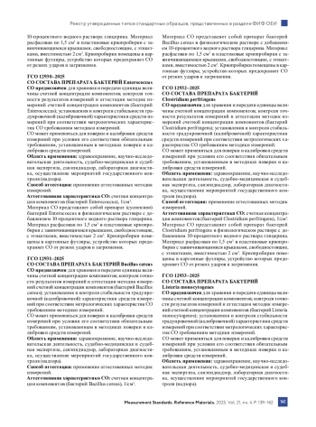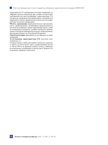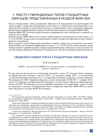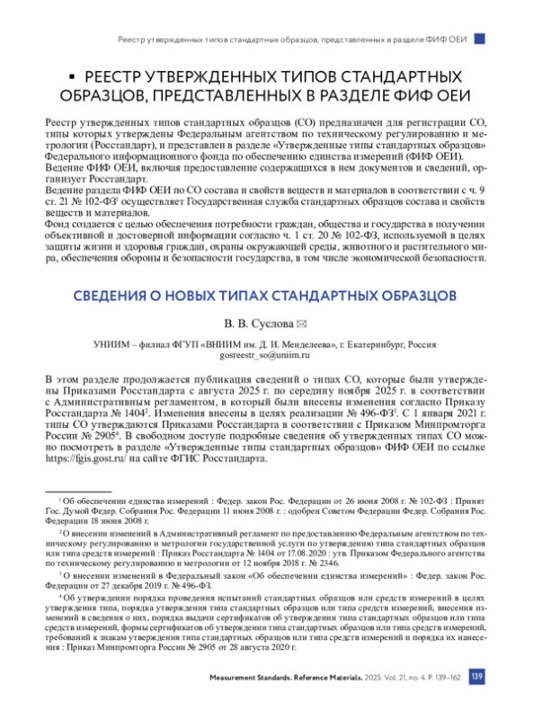 В этом разделе продолжается публикация сведений о типах СО, которые были утверждены Приказами Росстандарта с августа 2025 г. по середину ноября 2025 г. в соответствии с Административным регламентом, в который были внесены изменения согласно Приказу Росстандарта № 14042. Изменения внесены в целях реализации № 496-ФЗ3. С 1 января 2021 г. типы СО утверждаются Приказами Росстандарта в соответствии с Приказом Минпромторга России № 29054. В свободном доступе подробные сведения об утвержденных типах СО можно посмотреть в разделе «Утвержденные типы стандартных образцов» ФИФ ОЕИ по ссылке https://fgis. gost. ru/ на сайте ФГИС Росстандарта.