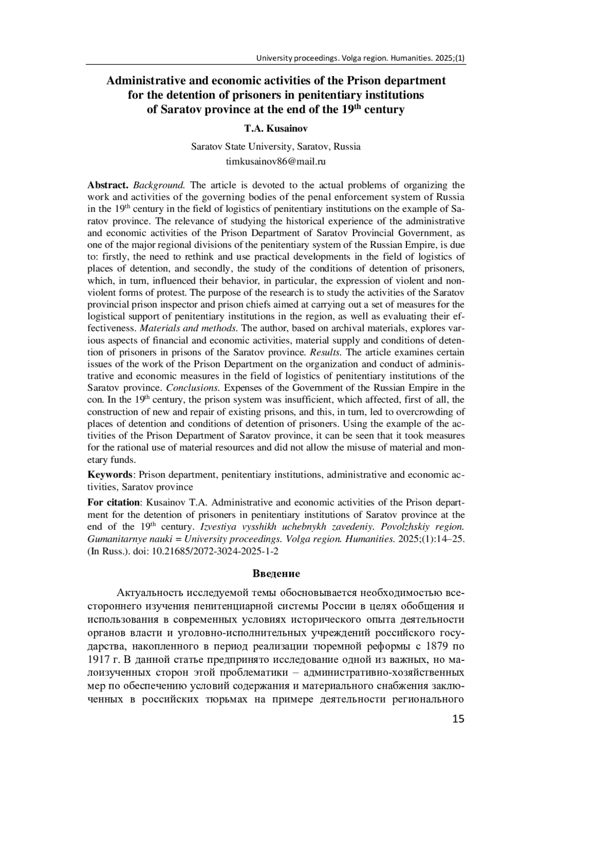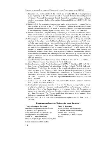 18. Кусаинов Т. А. Структура и органы управления пенитенциарной системы Саратовской губернии на рубеже XIX-XX веков // Проблемы Российской цивилизации и методики преподавания истории: сб. науч. тр. Саратов: Наука, 2024. Вып. XVI. С. 31-36.