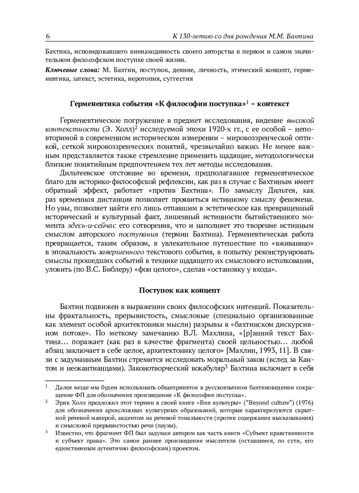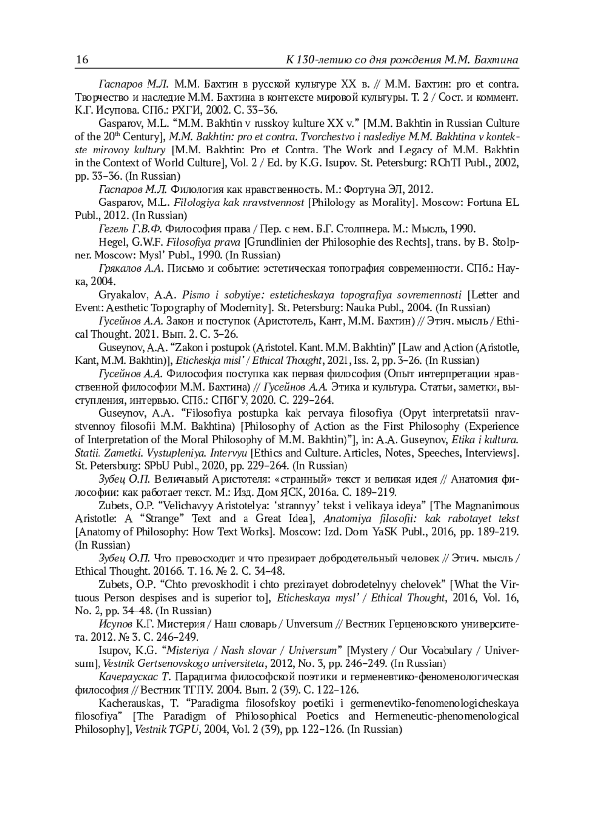 32. Guseynov, A.A. “Filosofiya postupka kak pervaya filosofiya (Opyt interpretatsii nravstvennoy filosofii M.M. Bakhtina) [Philosophy of Action as the First Philosophy (Experience of Interpretation of the Moral Philosophy of M.M. Bakhtin)”], in: A.A. Guseynov, Etika i kultura. Statii. Zametki. Vystupleniya. Intervyu [Ethics and Culture. Articles, Notes, Speeches, Interviews]. St. Petersburg: SPbU Publ., 2020, pp. 229-264. (In Russian).