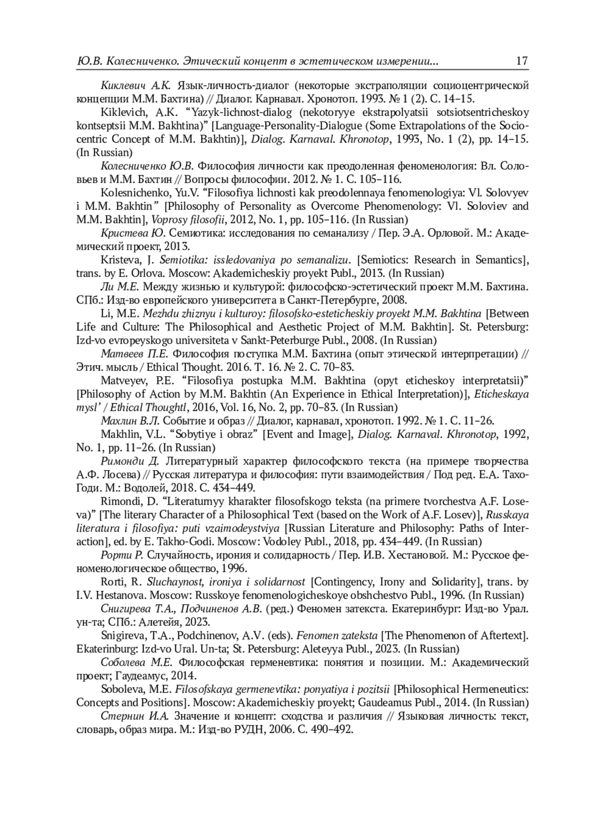 44. Kolesnichenko, Yu.V. “Filosofiya lichnosti kak preodolennaya fenomenologiya: Vl. Solovyev i M.M. Bakhtin” [Philosophy of Personality as Overcome Phenomenology: Vl. Soloviev and M.M. Bakhtin], Voprosy filosofii, 2012, No. 1, pp. 105-116. (In Russian).