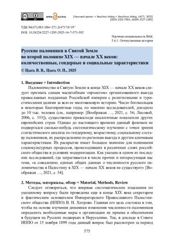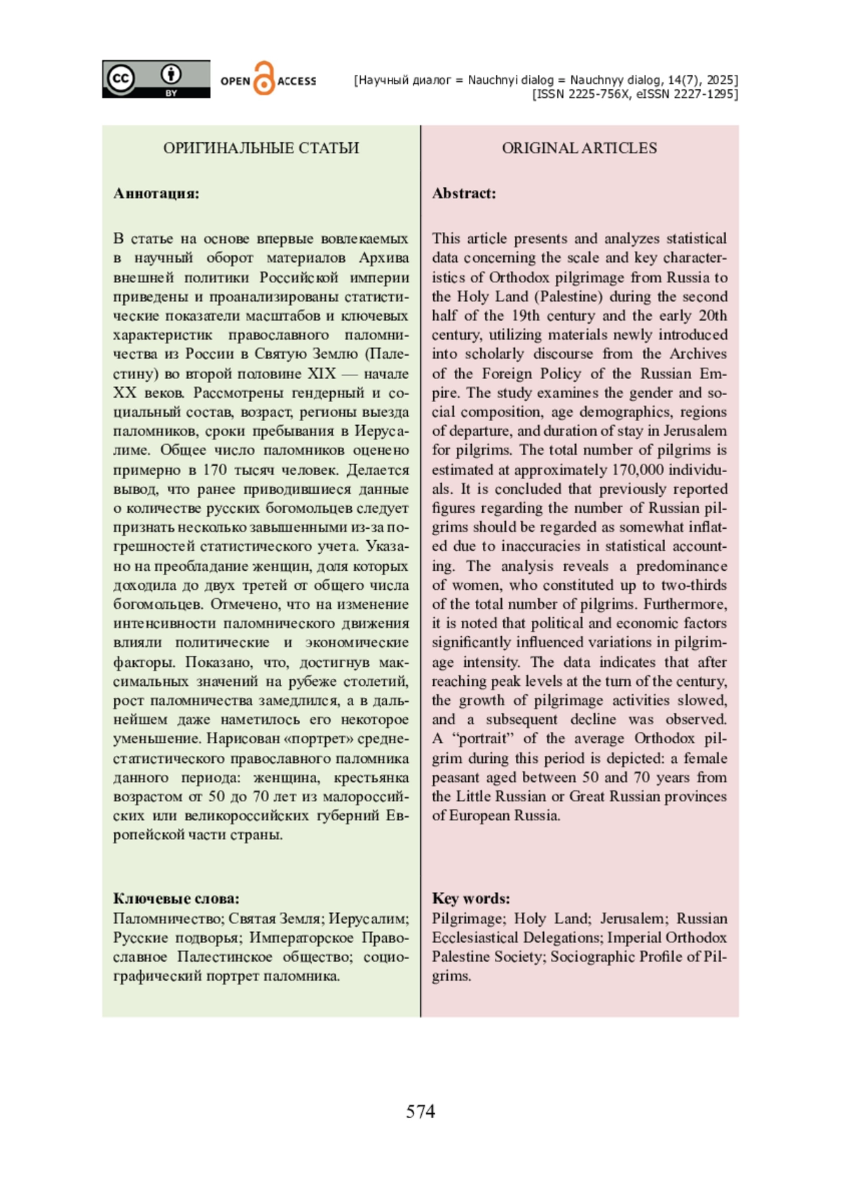 В статье на основе впервые вовлекаемых в научный оборот материалов Архива внешней политики Российской империи приведены и проанализированы статистические показатели масштабов и ключевых характеристик православного паломничества из России в Святую Землю (Палестину) во второй половине XIX — начале ХХ веков. Рассмотрены гендерный и социальный состав, возраст, регионы выезда паломников, сроки пребывания в Иерусалиме. Общее число паломников оценено примерно в 170 тысяч человек. Делается вывод, что ранее приводившиеся данные о количестве русских богомольцев следует признать несколько завышенными из-за погрешностей статистического учета. Указано на преобладание женщин, доля которых доходила до двух третей от общего числа богомольцев. Отмечено, что на изменение интенсивности паломнического движения влияли политические и экономические факторы. Показано, что, достигнув максимальных значений на рубеже столетий, рост паломничества замедлился, а в дальнейшем даже наметилось его некоторое уменьшение. Нарисован «портрет» среднестатистического православного паломника данного периода: женщина, крестьянка возрастом от 50 до 70 лет из малороссийских или великороссийских губерний Европейской части страны.