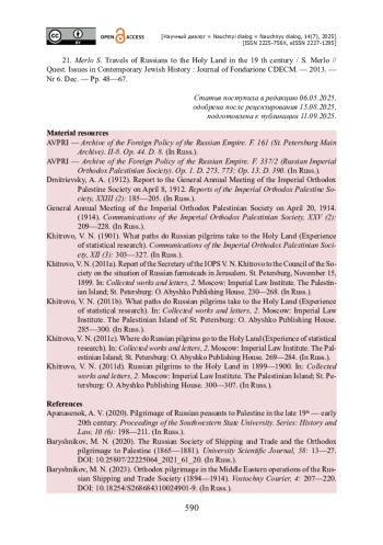 21. Merlo S. Travels of Russians to the Holy Land in the 19 th century / S. Merlo // Quest. Issues in Contemporary Jewish History : Journal of Fondazione CDECM. - 2013. - Nr 6. Dec. - Pp. 48-67.