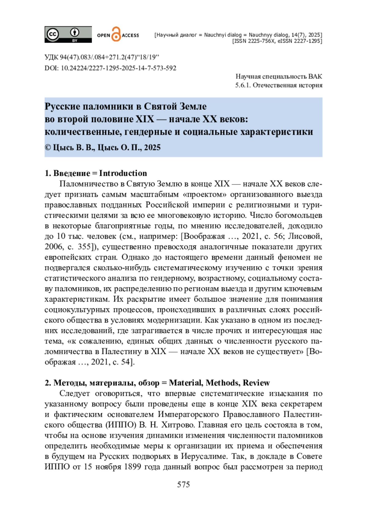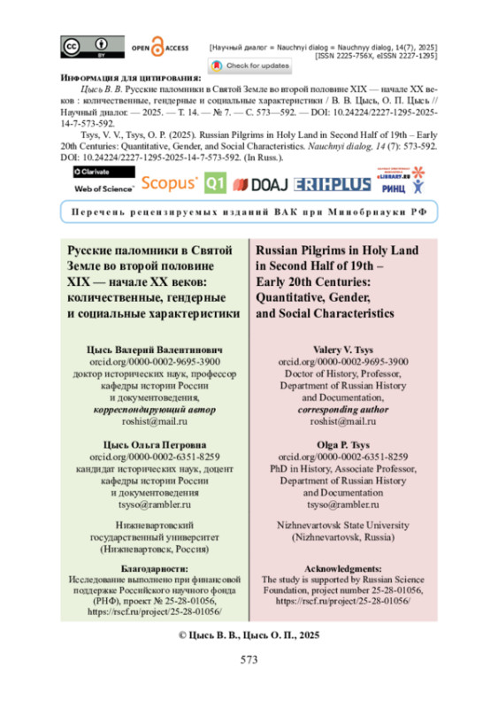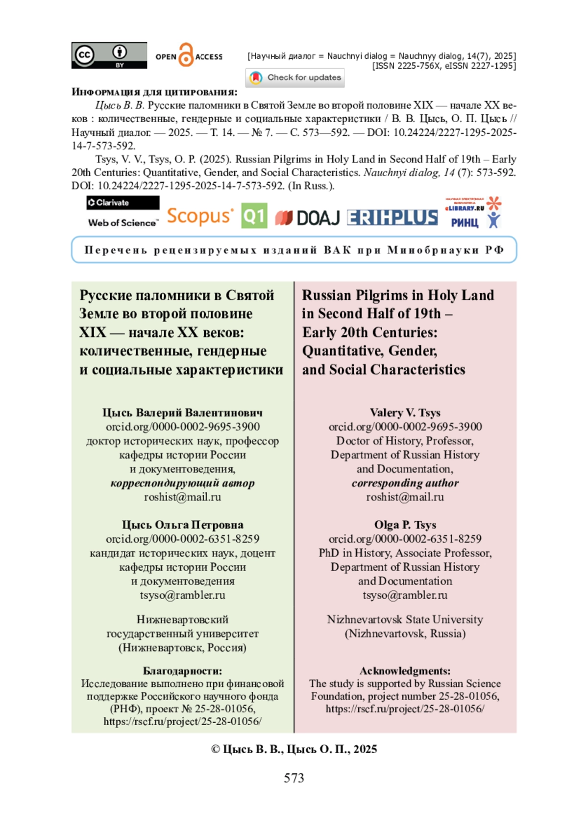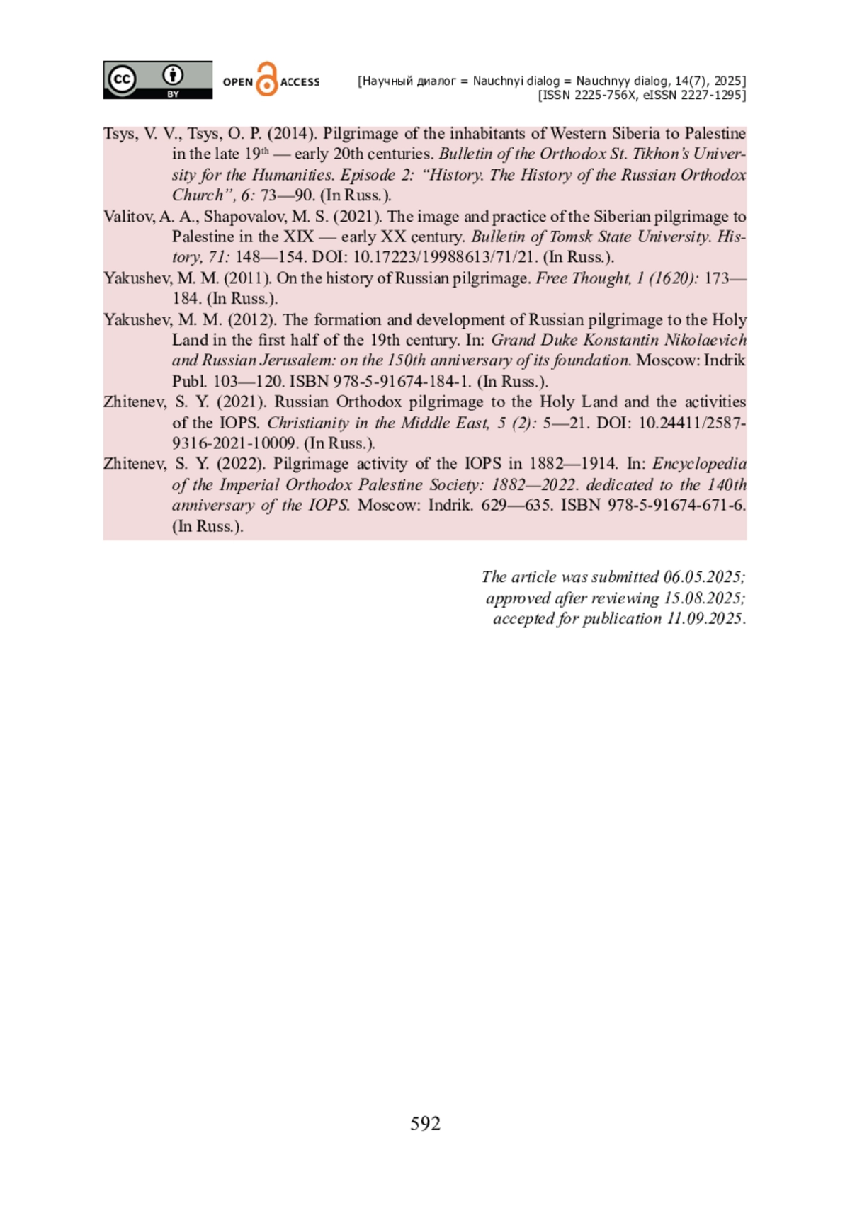 13. Цысь В. В. Паломничество жителей Западной Сибири в Палестину в конце XIX - начале ХХ вв. / В. В. Цысь, О. П. Цысь // Вестник Православного свято-Тихоновского гуманитарного университета. Серия 2 : «История. История Русской Православной церкви». - 2014. - № 6. - С. 73-90.