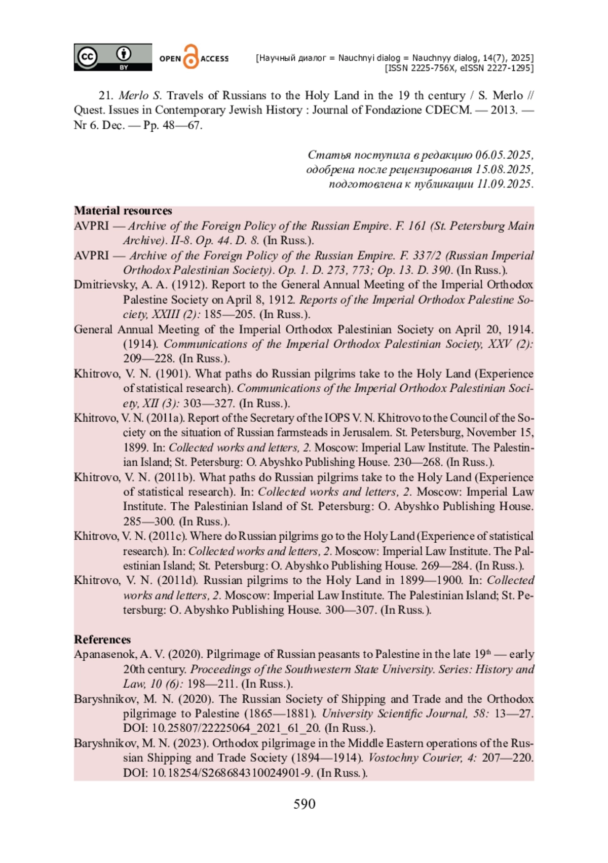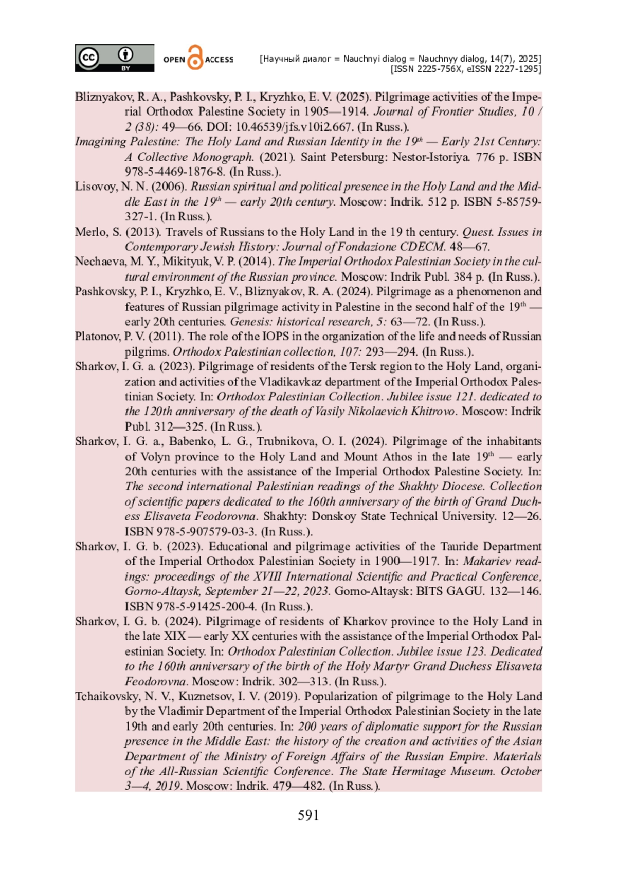 4. Близняков Р. А. Паломническая деятельность Императорского Православного Палестинского Общества в 1905-1914 гг. / Р. А. Близняков, П. И. Пашковский, Е. В. Крыжко // Журнал фронтирных исследований. - 2025. - Т. 10. - № 2 (38). - С. 49-66. - https://doi.org/10.46539/jfs.v10i2.667.