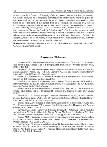 46. Liapunov, V. “Notes”, in: M. Bakhtin, Towards Philosophy of the Act, trans. and notes by V. Liapunov, eds. V. Liapunov, M. Holquist. Austin: University of Texas Press, 1993, pp. 77-100.
