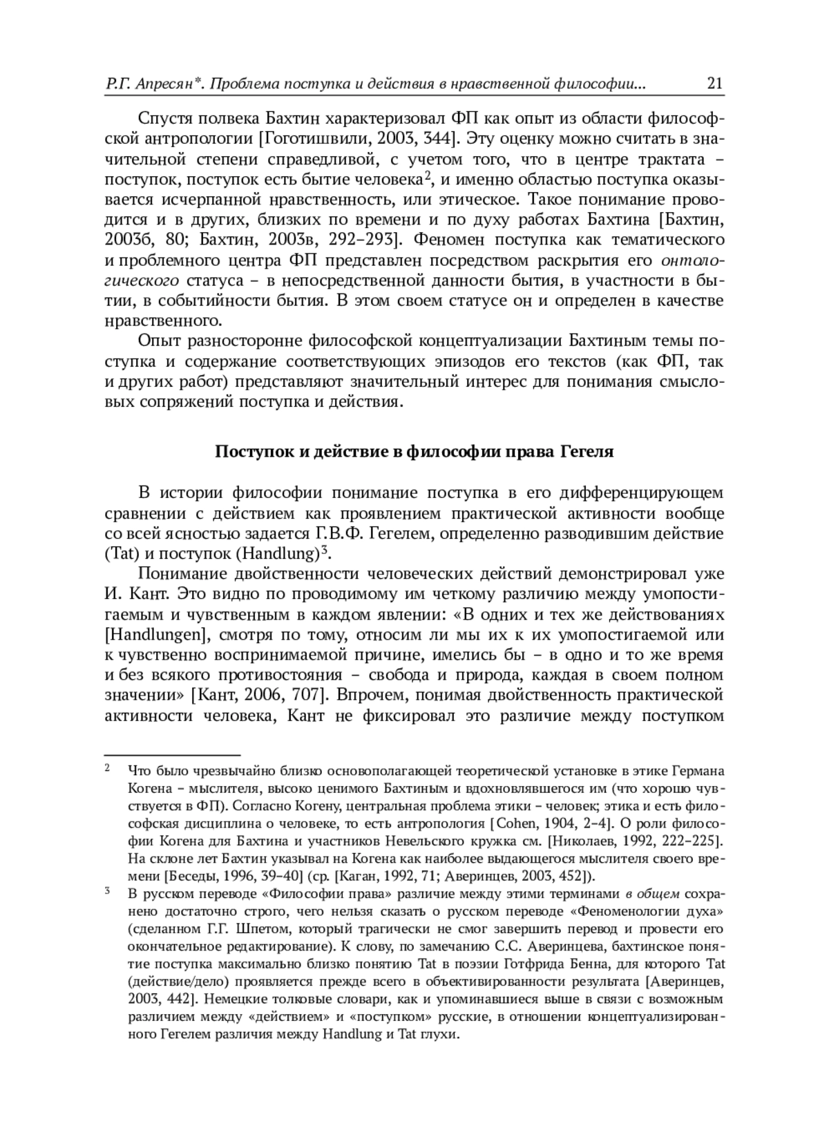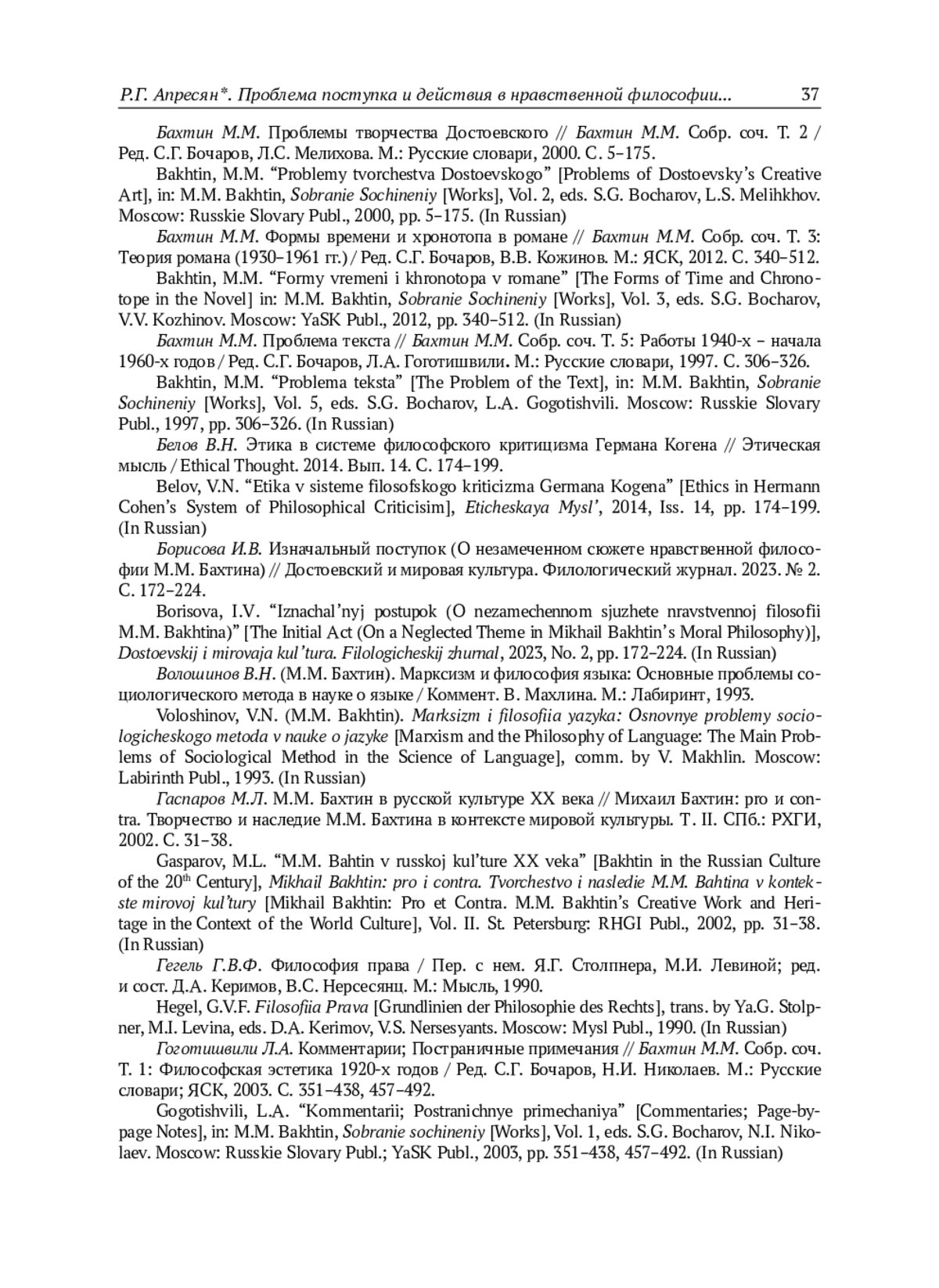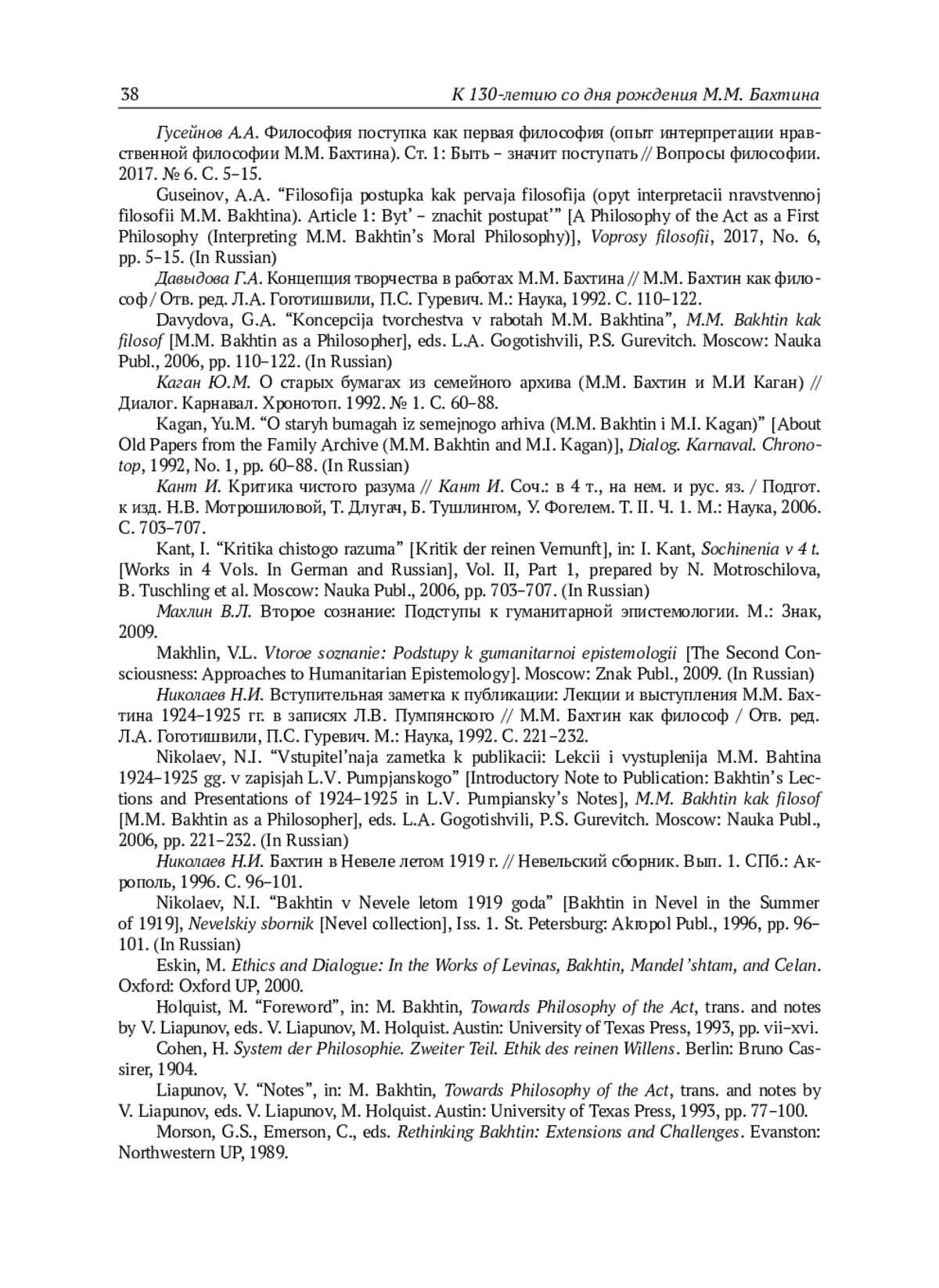 30. Guseinov, A.A. “Filosofija postupka kak pervaja filosofija (opyt interpretacii nravstvennoj filosofii M.M. Bakhtina). Article 1: Byt’ - znachit postupat’” [A Philosophy of the Act as a First Philosophy (Interpreting M.M. Bakhtin’s Moral Philosophy)], Voprosy filosofii, 2017, No. 6, pp. 5-15. (In Russian).