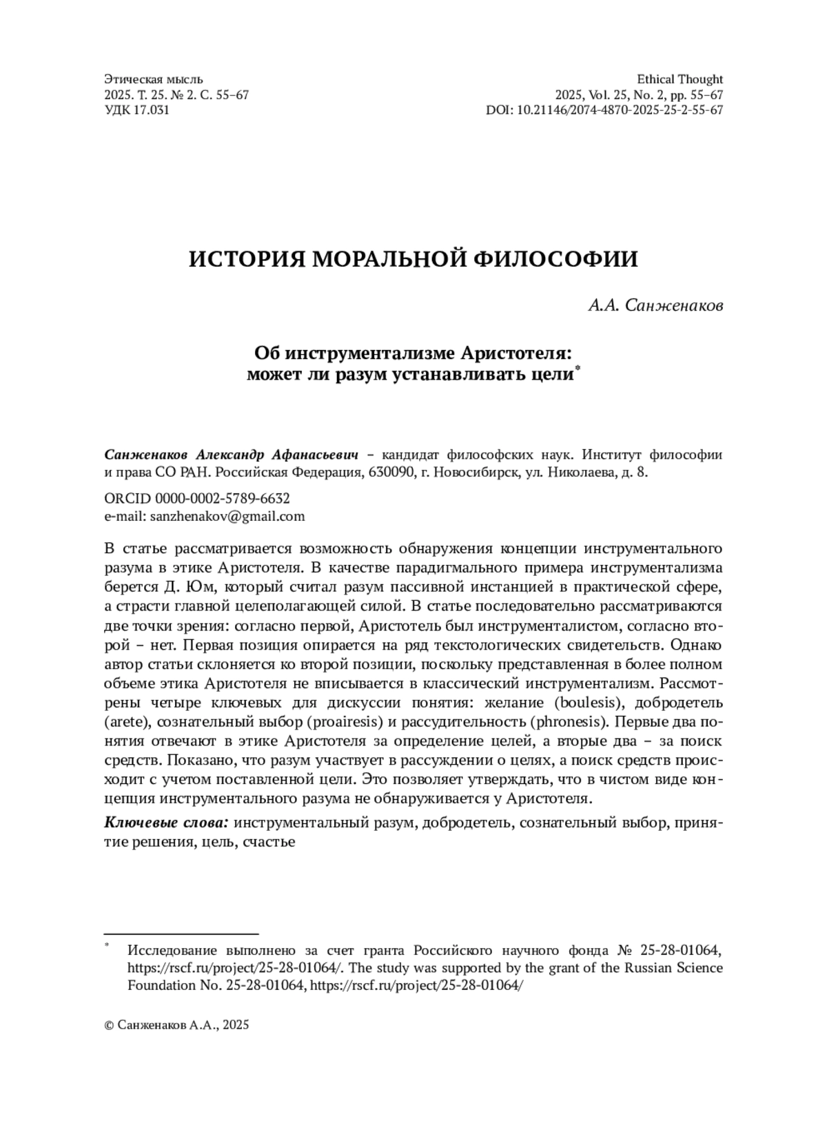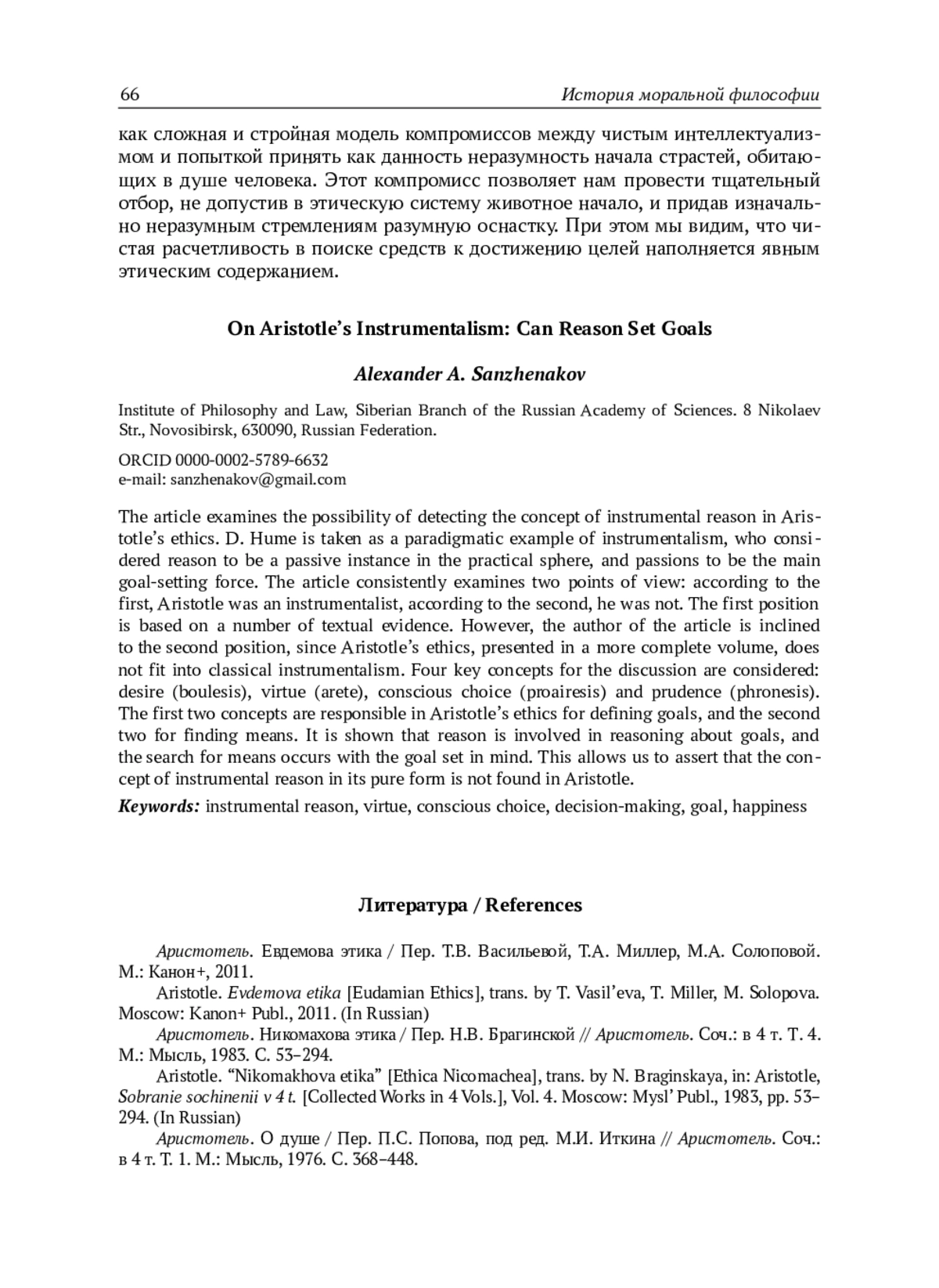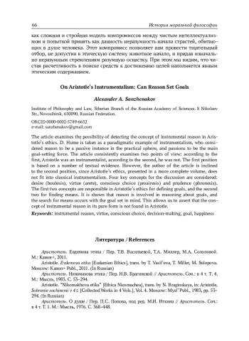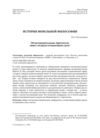 В статье рассматривается возможность обнаружения концепции инструментального разума в этике Аристотеля. В качестве парадигмального примера инструментализма берется Д. Юм, который считал разум пассивной инстанцией в практической сфере, а страсти главной целеполагающей силой. В статье последовательно рассматриваются две точки зрения: согласно первой, Аристотель был инструменталистом, согласно второй – нет. Первая позиция опирается на ряд текстологических свидетельств. Однако автор статьи склоняется ко второй позиции, поскольку представленная в более полном объеме этика Аристотеля не вписывается в классический инструментализм. Рассмотрены четыре ключевых для дискуссии понятия: желание (boulesis), добродетель (arete), сознательный выбор (proairesis) и рассудительность (phronesis). Первые два понятия отвечают в этике Аристотеля за определение целей, а вторые два – за поиск средств. Показано, что разум участвует в рассуждении о целях, а поиск средств происходит с учетом поставленной цели. Это позволяет утверждать, что в чистом виде концепция инструментального разума не обнаруживается у Аристотеля.