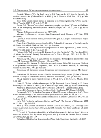 15. Platonov, R.S. “Rol’ nravstvennykh dobrodeteley v etike Aristotelya” [The Function of Ethical Virtues in Aristotle’s Ethics], Etitcheskaya mysl’ / Ethical Thought, 2021, Vol. 21, No. 2, pp. 77-89. (In Russian).