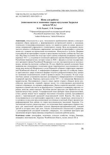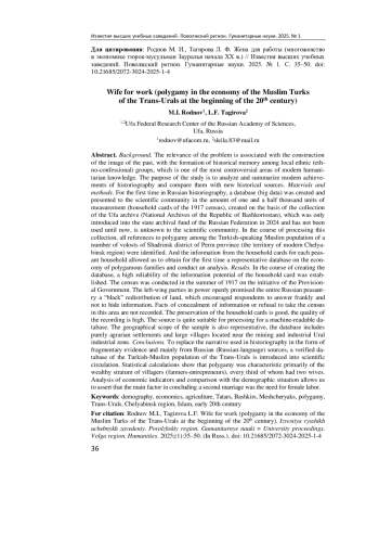 Актуальность и цели. Актуальность проблематики связана с конструированием образа прошлого, с формированием исторической памяти у локальных этнических (этноконфессиональных) групп, что является одним из самых дискуссионных направлений современного гуманитарного знания. Цель исследования заключается в анализе и обобщении современных достижений историографии и сопоставлении их с новыми историческими источниками. Материалы и методы. Впервые в российской историографии создана и представлена научному сообществу база данных (Big Data) в количестве полутора тысяч единиц измерения (подворных карточек переписи 1917 г.), созданная по коллекции уфимского архива (Национального архива Республики Башкортостан), которая только в 2024 г. введена в состав государственного архивного фонда Российской Федерации и до сих пор практически не использовалась, неизвестна научному сообществу. В ходе обработки данной коллекции были выявлены все упоминания о полигамии среди тюркоязычного мусульманского населения ряда волостей Шадринского уезда Пермской губернии (территория современной Челябинской области). А информация подворных карточек по хозяйству каждого крестьянского двора позволила впервые получить репрезентативную базу данных по экономике полигамических семей и провести анализ. Результаты. В ходе создания базы данных установлена высокая достоверность информационного потенциала подворной карточки. Перепись проходила летом 1917 г. по инициативе Временного правительства. Находившиеся у власти левые партии открыто обещали всему российскому крестьянству «черный» передел земли, что стимулировало респондентов отвечать откровенно, не скрывать информацию. Факты сокрытия сведений, отказа от переписи в данной местности не фиксируются. Сохранность подворных карточек хорошая, качество записи высокое. Источник вполне пригоден для обработки под машиночитаемую базу данных. Географический охват выборки также репрезентативен, в базу данных вошли чисто аграрные поселения и большие селения, находившиеся рядом с горнозаводской уральской индустриальной зоной. Выводы. На смену использовавшемуся в историографии нарративу в виде отрывочных свидетельств и в основном по русским (русскоязычным) источникам в научный оборот вводится верифицированная база данных по тюрко-мусульманскому населению Зауралья. Статистический подсчет свидетельствует, что полигамия была характерна в первую очередь для зажиточной прослойки сельчан (фермеров-предпринимателей), каждый третий из которых имел двух жен. Анализ экономических показателей и сравнение с демографической ситуацией позволяет утверждать, что основным фактором при заключении второго брака являлась потребность в женских рабочих руках.