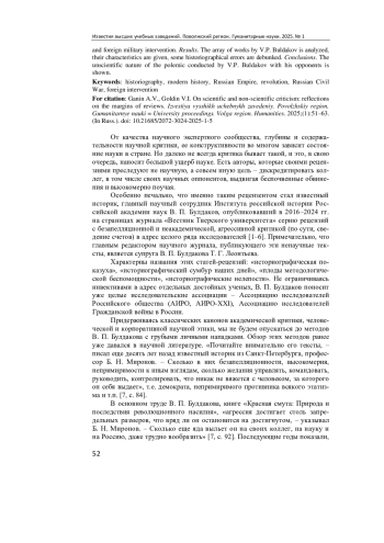 Актуальность и цели. Исследование посвящено анализу работ известного историка, главного научного сотрудника Института российской истории Российской академии наук В. П. Булдакова, которые могут быть отнесены к категории ненаучных. Актуальность работы определяется необходимостью объективно реагировать на историографические вызовы. Материалы и методы. Исследованы труды В. П. Булдакова советского и постсоветского периода. Дается обзор используемых методов ведения полемики с оппонентами. Рассмотрены некоторые конкретно-исторические сюжеты, ставшие предметом дискуссий, прежде всего вопрос об оценке хронологических рамок и характера Гражданской войны и иностранной военной интервенции. Результаты. Проанализирован массив трудов В. П. Булдакова, дана характеристика их особенностей, развенчаны некоторые историографические ошибки. Выводы. Показан ненаучный характер полемики, которую ведет В. П. Булдаков со своими оппонентами.