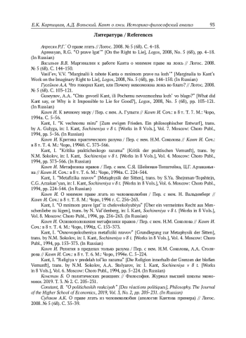 10. Kant, I. “Kritika prakticheskogo razuma” [Kritik der praktischen Vernunft], trans. by N.M. Sokolov, in: I. Kant, Sochineniya v 8 t. [Works in 8 Vols.], Vol. 4. Moscow: Choro Publ., 1994, pp. 373-566. (In Russian).