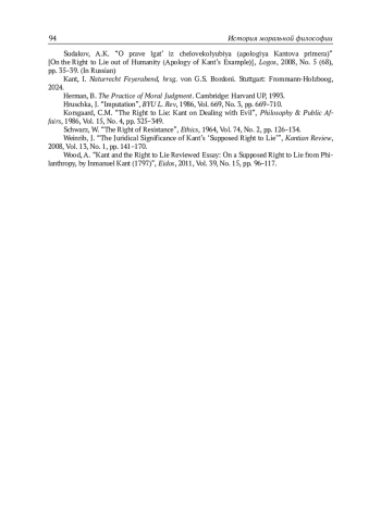 22. Sudakov, A.K. “O prave lgat’ iz chelovekolyubiya (apologiya Kantova primera)” [On the Right to Lie out of Humanity (Apology of Kant’s Example)], Logos, 2008, No. 5 (68), pp. 35-39. (In Russian).