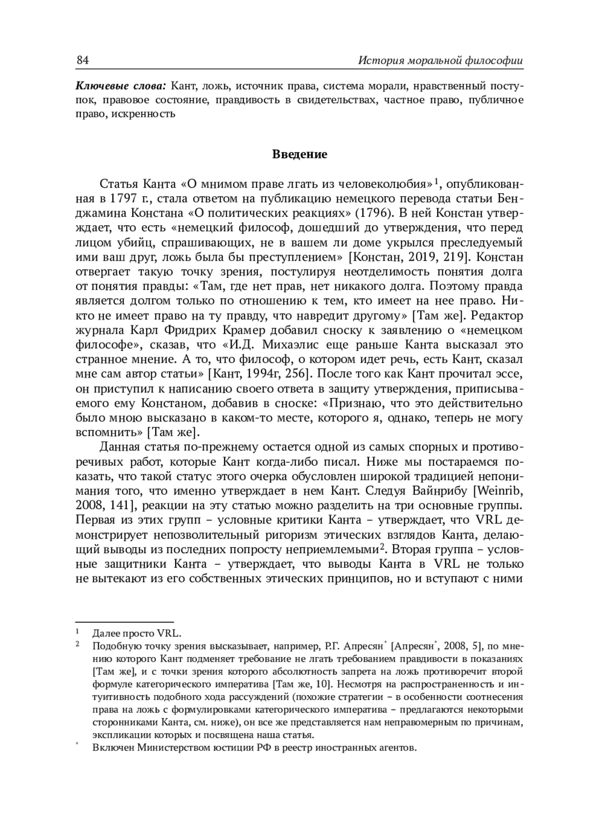 Статья Канта «О мнимом праве лгать из человеколюбия»1, опубликованная в 1797 г., стала ответом на публикацию немецкого перевода статьи Бенджамина Констана «О политических реакциях» (1796). В ней Констан утверждает, что есть «немецкий философ, дошедший до утверждения, что перед лицом убийц, спрашивающих, не в вашем ли доме укрылся преследуемый ими ваш друг, ложь была бы преступлением» [Констан, 2019, 219]. Констан отвергает такую точку зрения, постулируя неотделимость понятия долга от понятия правды: «Там, где нет прав, нет никакого долга. Поэтому правда является долгом только по отношению к тем, кто имеет на нее право. Никто не имеет право на ту правду, что навредит другому» [Там же]. Редактор журнала Карл Фридрих Крамер добавил сноску к заявлению о «немецком философе», сказав, что «И. Д. Михаэлис еще раньше Канта высказал это странное мнение. А то, что философ, о котором идет речь, есть Кант, сказал мне сам автор статьи» [Кант, 1994г, 256]. После того как Кант прочитал эссе, он приступил к написанию своего ответа в защиту утверждения, приписыва - емого ему Констаном, добавив в сноске: «Признаю, что это действительно было мною высказано в каком-то месте, которого я, однако, теперь не могу вспомнить» [Там же].