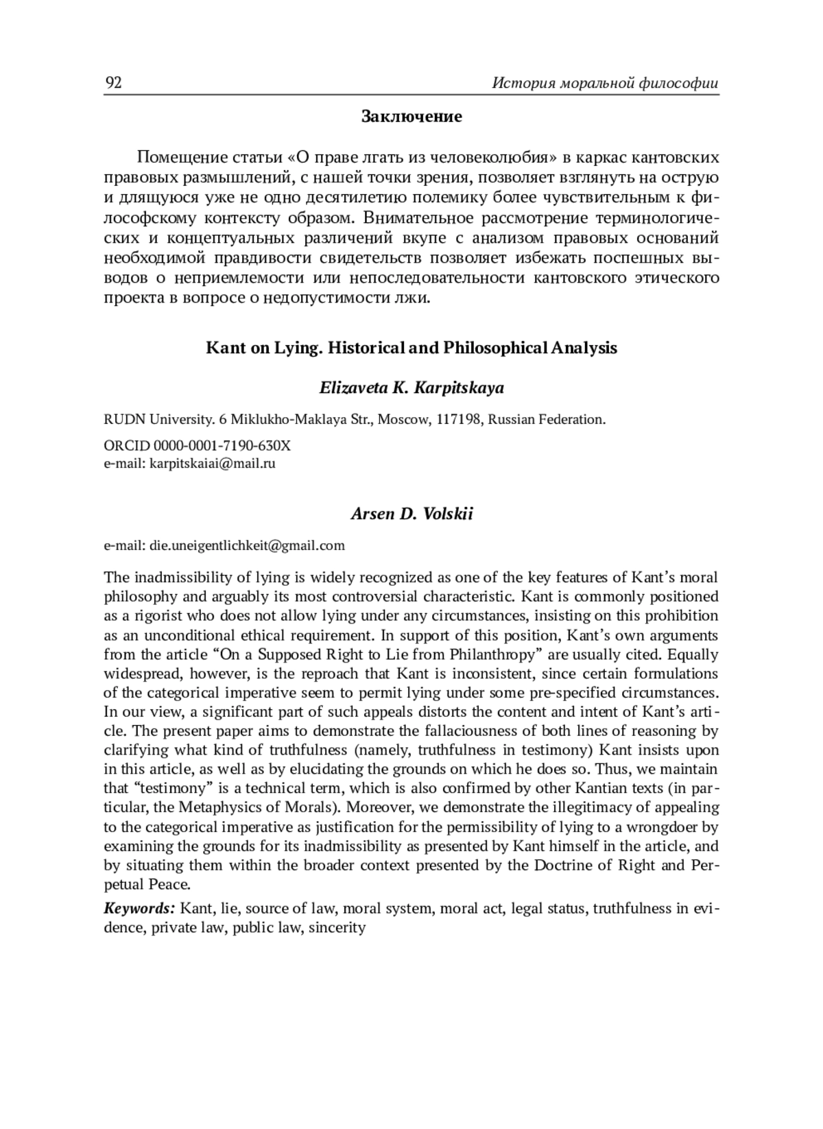 Недопустимость лжи, по общему признанию, является одной из ключевых особенностей моральной философии Канта и чуть ли не самой ее дискуссионной характеристикой. Широко принято при этом позиционирование Канта как ригориста, не допускающего ложь ни при каких обстоятельствах, настаивающего при этом на данном запрете как на безусловном этическом требовании. В пользу такой позиции, как правило, приводятся аргументы самого же Канта из статьи «О мнимом праве лгать из человеколюбия». Не менее распространен и упрек Канта в непоследовательности в силу того, что некоторые формулировки категорического императива допускают ложь в некоторых предварительно оговоренных обстоятельствах. На взгляд авторов, существенная часть такого рода апелляций искажает содержание и замысел кантовской статьи. Данная статья призвана продемонстрировать ошибочность обоих ходов рассуждения путем уточнения того, на правдивости какого рода (а именно, на правдивости свидетельств) настаивает Кант в анализируемой статье, а также прояснить основания, исходя из которых он это делает. Так, авторы настаивают на том, что «свидетельство» является техническим термином, что подтверждается также и другими текстами Канта (в частности, «Метафизикой нравов»). Помимо этого, в статье показана неправомерность обращения к категорическому императиву в качестве обоснования допустимости лжи злоумышленнику путем рассмотрения оснований ее недопустимости, приводимых самим Кантом в его статье, и помещением их в более широкий контекст, представленный «Учением о праве» и «К вечному миру».
