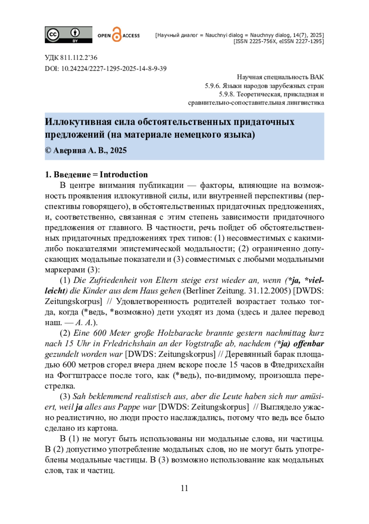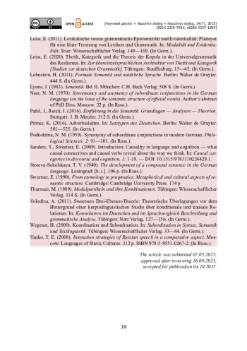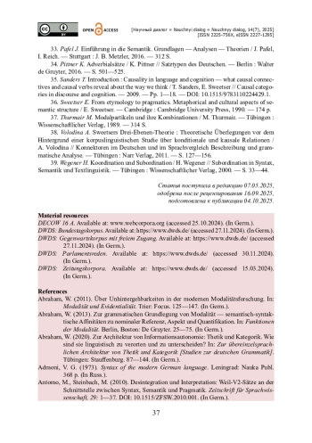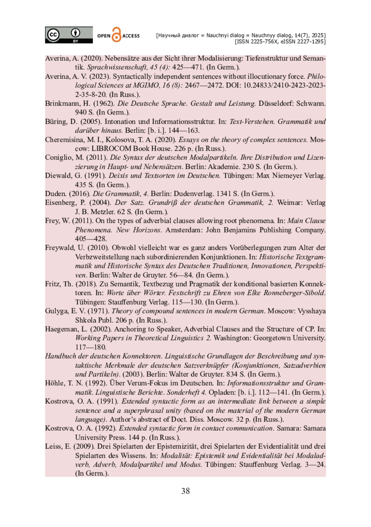 15. Averina A. Nebensätze aus der Sicht ihrer Modalisierung : Tiefenstruktur und Semantik / A. Averina // Sprachwissenschaft. - 2020. - Bd. 45. - № 4. - S. 425-471.