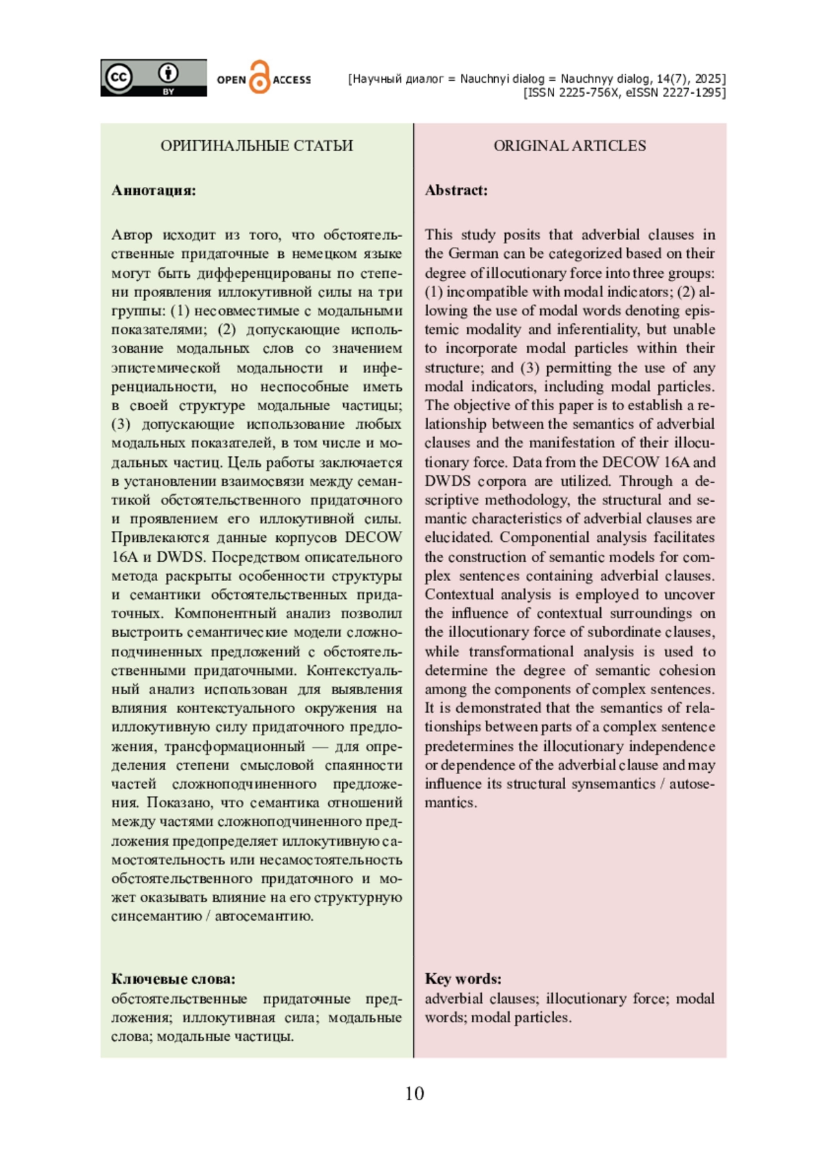 Автор исходит из того, что обстоятельственные придаточные в немецком языке могут быть дифференцированы по степени проявления иллокутивной силы на три группы: (1) несовместимые с модальными показателями; (2) допускающие использование модальных слов со значением эпистемической модальности и инференциальности, но неспособные иметь в своей структуре модальные частицы; (3) допускающие использование любых модальных показателей, в том числе и модальных частиц. Цель работы заключается в установлении взаимосвязи между семантикой обстоятельственного придаточного и проявлением его иллокутивной силы. Привлекаются данные корпусов DECOW 16A и DWDS. Посредством описательного метода раскрыты особенности структуры и семантики обстоятельственных придаточных. Компонентный анализ позволил выстроить семантические модели сложноподчиненных предложений с обстоятельственными придаточными. Контекстуальный анализ использован для выявления влияния контекстуального окружения на иллокутивную силу придаточного предложения, трансформационный — для определения степени смысловой спаянности частей сложноподчиненного предложения. Показано, что семантика отношений между частями сложноподчиненного предложения предопределяет иллокутивную самостоятельность или несамостоятельность обстоятельственного придаточного и может оказывать влияние на его структурную синсемантию / автосемантию.
