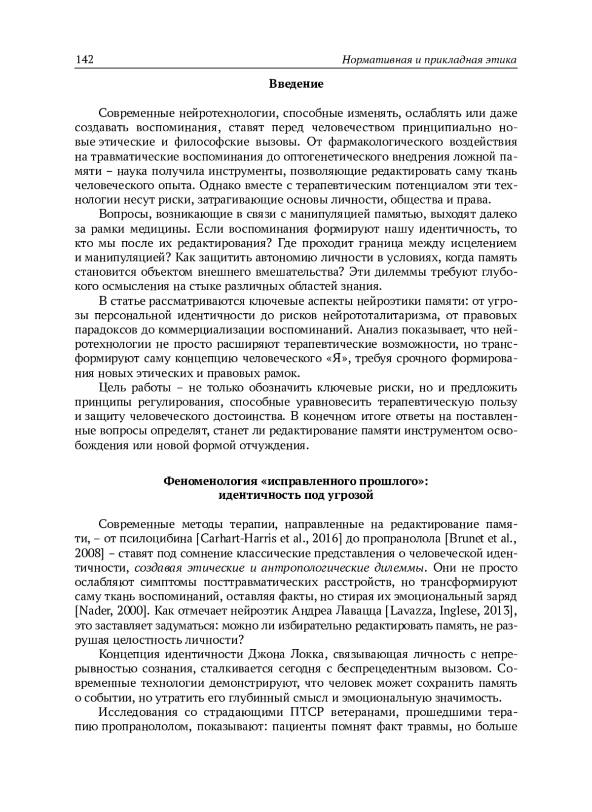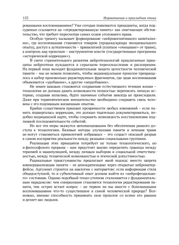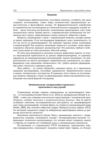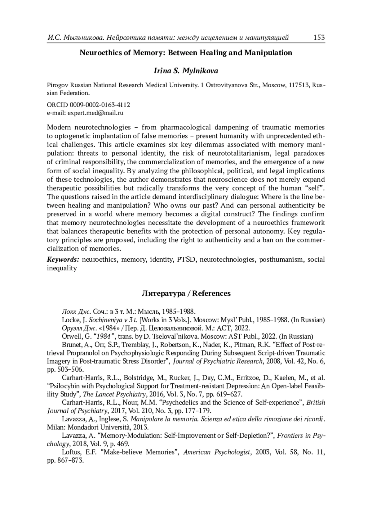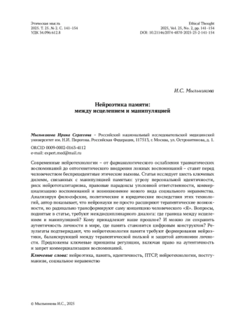 Современные нейротехнологии – от фармакологического ослабления травматических воспоминаний до оптогенетического внедрения ложных воспоминаний – ставят перед человечеством беспрецедентные этические вызовы. Статья исследует шесть ключевых дилемм, связанных с манипуляцией памятью: угрозу персональной идентичности, риск нейрототалитаризма, правовые парадоксы уголовной ответственности, коммерциализацию воспоминаний и возникновение нового вида социального неравенства. Анализируя философские, политические и юридические последствия этих технологий, автор показывает, что нейронауки не просто расширяют терапевтические возможности, но радикально трансформируют саму концепцию человеческого «Я». Вопросы, поднятые в статье, требуют междисциплинарного диалога: где граница между исцелением и манипуляцией? Кому принадлежит наше прошлое? И можно ли сохранить аутентичность личности в мире, где память становится цифровым конструктом? Результаты подтверждают, что нейротехнологии памяти требуют формирования нейроэтики, балансирующей между терапевтической пользой и защитой автономии личности. Предложены ключевые принципы регуляции, включая право на аутентичность и запрет коммерциализации воспоминаний.