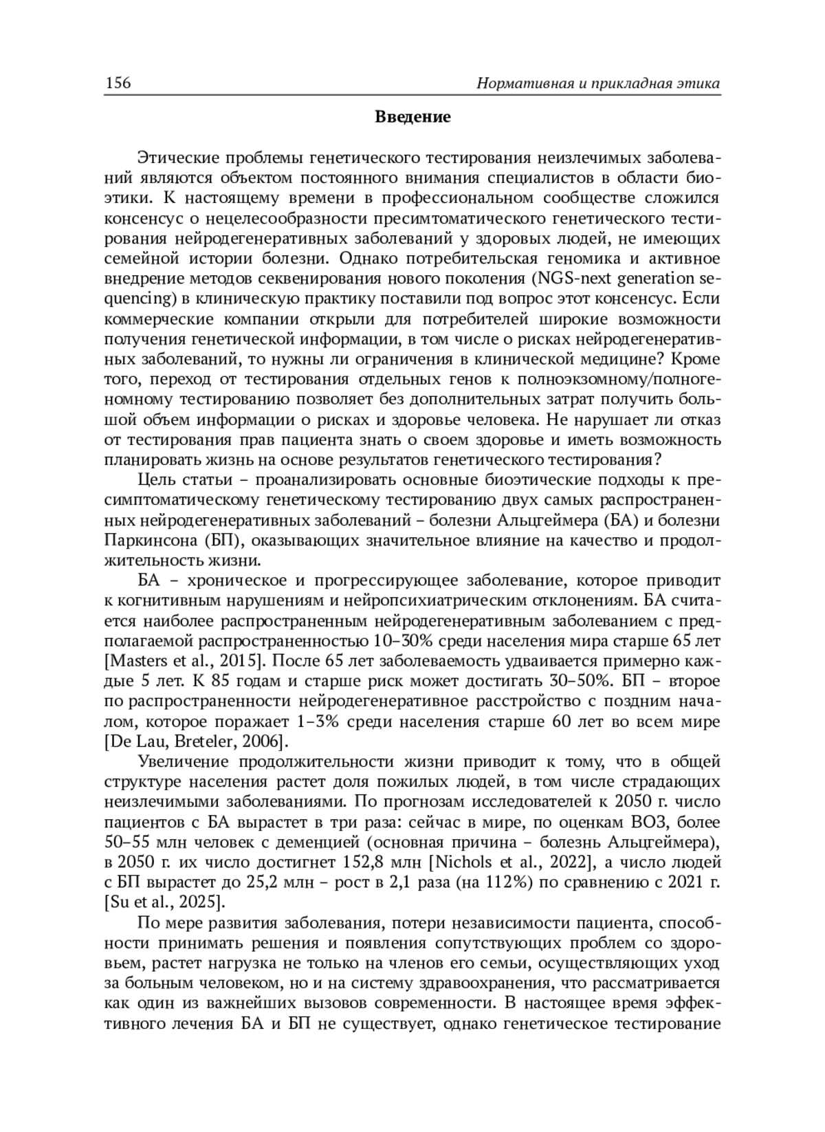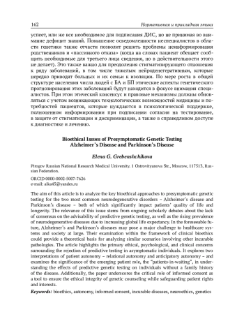 Цель статьи – проанализировать основные биоэтические подходы к пресимптоматическому генетическому тестированию двух самых распространенных нейродегенеративных заболеваний – болезни Альцгеймера и болезни Паркинсона, оказывающих значительное влияние на качество и продолжительность жизни больных людей. Актуальность рассматриваемой проблематики обусловлена как полемикой исследователей вокруг консенсуса о нецелесообразности предиктивного генетического тестирования, так и увеличением числа людей, страдающих нейродегенеративными заболеваниями, в связи с ростом продолжительности жизни населения. Болезнь Альцгеймера и болезнь Паркинсона в обозримой перспективе могут стать серьезным вызовом для системы здравоохранения и общества в целом, их осмысление в клинической биоэтике может иметь значение для теоретического анализа сходных ситуаций, связанных с другими неизлечимыми патологиями. В статье выделены основные этические, психологические и клинические аспекты отказа от предиктивного тестирования здоровых людей; раскрыты две трактовки автономии пациента – реляционная автономия и предвосхищающая автономия; показано значение новой пациентской роли «пациент-в-ожидании» для понимания эффектов предиктивного генетического тестирования людей, не имеющих семейной истории патологии; раскрыта особая роль добровольного информированного согласия как инструмента, обеспечивающего этичность медико-генетического консультирования, а также защиту интересов и прав пациентов.