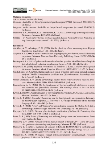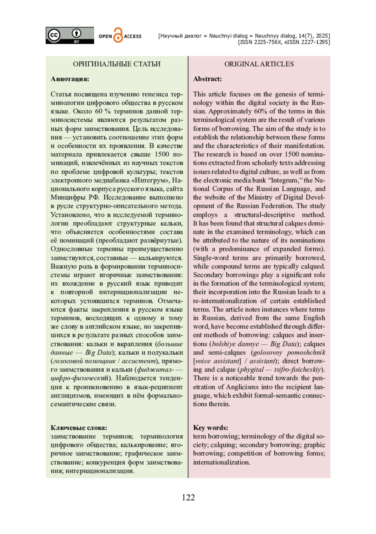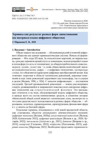 Статья посвящена изучению генезиса терминологии цифрового общества в русском языке. Около 60 % терминов данной терминосистемы являются результатом разных форм заимствования. Цель исследования — установить соотношение этих форм и особенности их проявления. В качестве материала привлекается свыше 1500 номинаций, извлечённых из научных текстов по проблеме цифровой культуры; текстов электронного медиабанка «Интегрум», Национального корпуса русского языка, сайта Минцифры РФ. Исследование выполнено в русле структурно-описательного метода. Установлено, что в исследуемой терминологии преобладают структурные кальки, что объясняется особенностями состава её номинаций (преобладают развёрнутые). Однословные термины преимущественно заимствуются, составные — калькируются. Важную роль в формировании терминосистемы играют вторичные заимствования: их вхождение в русский язык приводит к повторной интернационализации некоторых устоявшихся терминов. Отмечаются факты закрепления в русском языке терминов, восходящих к одному и тому же слову в английском языке, но закрепившихся в результате разных способов заимствования: кальки и вкрапления (большие данные — Big Data); кальки и полукальки (голосовой помощник / ассистент), прямого заимствования и кальки (фиджитал- — цифро-физический). Наблюдается тенденция к проникновению в язык-реципиент англицизмов, имеющих в нём формальносемантические связи.