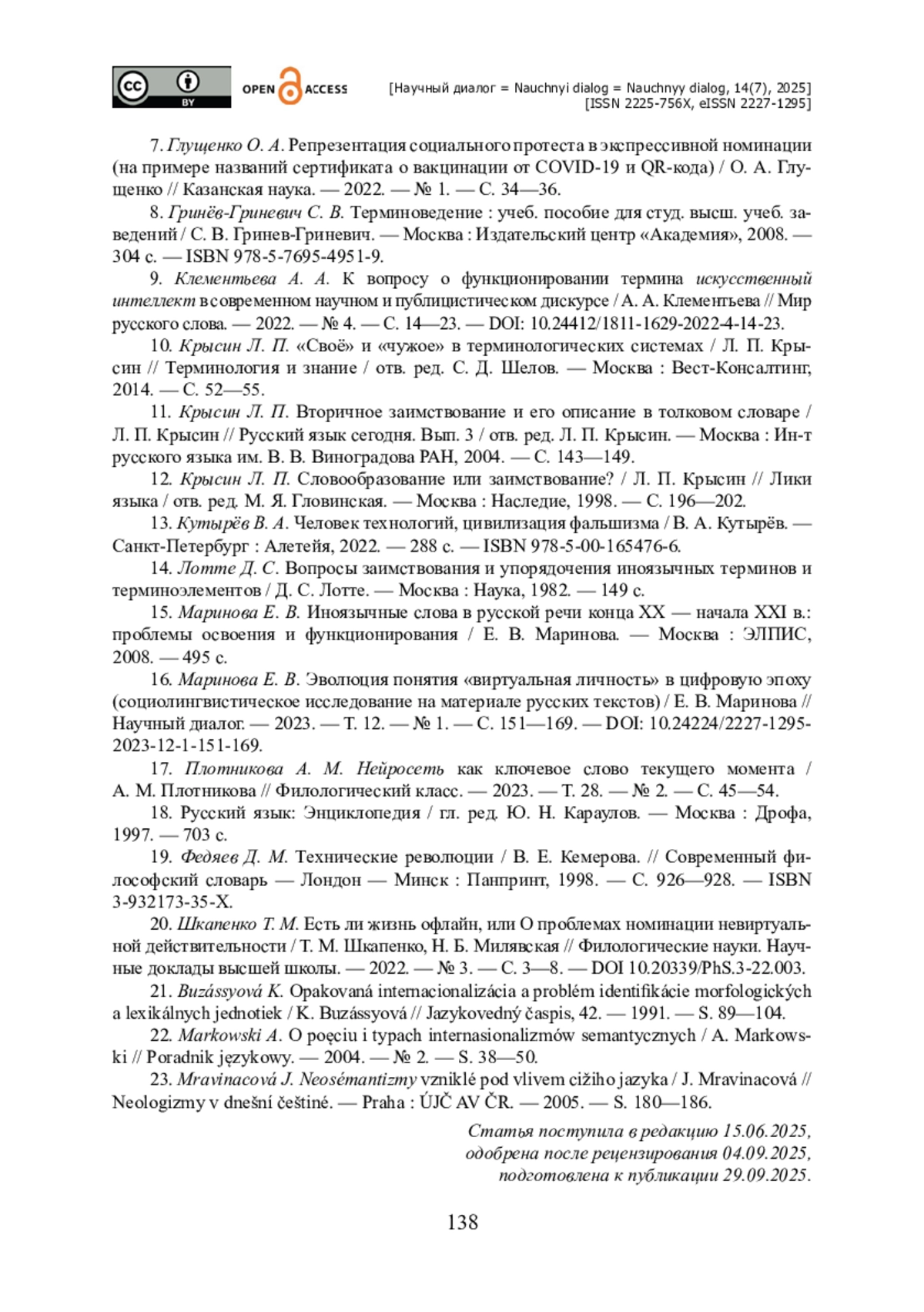 4. Волков В. В. «Искусственный «интеллект» и человеческий ум: футуристическая синекдоха и реальность (лингвистический и лингвоментальный аспекты) / В. В. Волков // Вестник Российского университета дружбы народов. Серия: Теория языка. Семиотика. Семантика. - 2020. - Т. 11. - № 4. - С. 745-759. - https://doi.org/10.22363/2313-2299-2020-11-4-745-759.