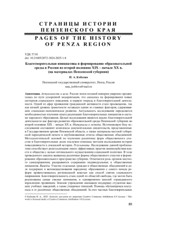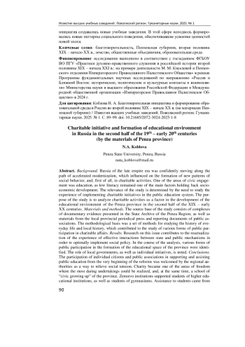 Актуальность и цели. Россия эпохи поздней империи уверенно продвигалась по пути ускоренной модернизации, что сказалось на формировании новых паттернов социального поведения, в первую очередь в благотворительной деятельности. Одной из сфер проявления гражданской активности стало просвещение, так как низкий уровень грамотности оставался одним из главных факторов, сдерживавших социально-экономическое развитие. Актуальность исследования определяется необходимостью изучения опыта реализации благотворительных инициатив в системе народного образования. Целью исследования является анализ благотворительной деятельности как фактора развития образовательной среды Пензенской губернии во второй половине XIX - начале XX в. Материалы и методы. Источниковую базу исследования составляют комплексы документальных свидетельств, представленные в Государственном архиве Пензенской области, а также материалы местной губернской периодической печати и опубликованные отчеты общественных объединений. Методологической основой по изучению различных форм общественного участия в благотворительных делах послужил комплекс методов исследования истории повседневности и локальной истории. Результаты. Исследование данной проблематики способствует реактуализации опыта эффективных практик взаимодействия власти и общества с целью оптимального осуществления социальной политики. В ходе проведенного анализа выявлены различные формы общественного участия в формировании образовательного пространства губернии. Отмечается роль органов местного самоуправления, раскрывается содержание индивидуальных и общественных инициатив. Выводы. Участие отдельных граждан и общественных объединений в деле поддержки и вспомоществования народному образованию с самого начала реформ приветствовалось региональной властью как способ снятия социального напряжения. Благотворительность стала одной из областей свободы, где могли быть реализованы самые смелые начинания, и одновременно школой «гражданского взросления» провинции. Земские учреждения оказывали поддержку студентам высших учебных заведений, а также учащимся гимназий. Помощь обучающимся поступала и от различных общественных объединений. За счет частных благотворительных инициатив создавались новые учебные заведения. В этой сфере исподволь формировались новые паттерны социального поведения, обеспечивавшие усвоение ценностей новой эпохи.