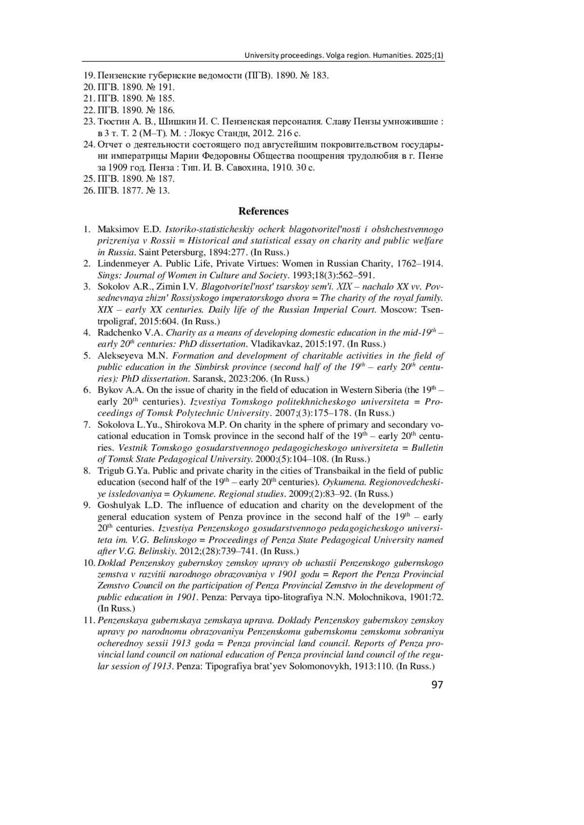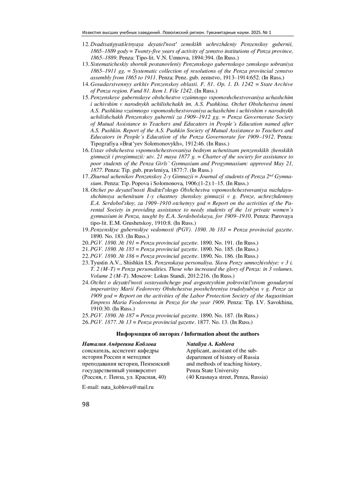 9. Гошуляк Л. Д. Влияние просветительства и благотворительности на развитие системы общего образования Пензенской губернии второй половины XIX - начала XX вв. // Известия Пензенского государственного педагогического университета им. В. Г. Белинского. 2012. № 28. С. 739-741. EDN: PJESRB