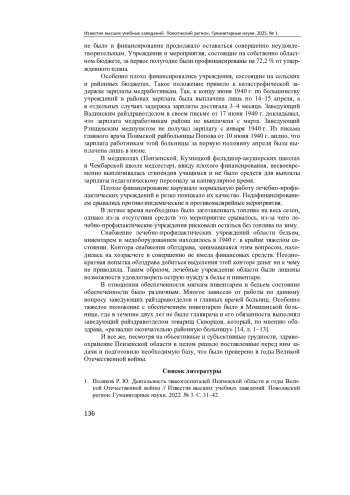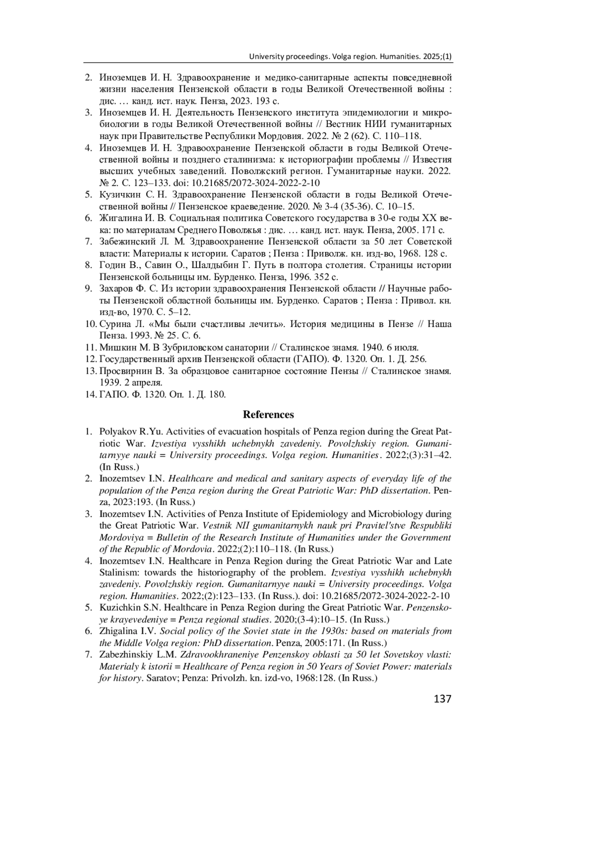4. Иноземцев И. Н. Здравоохранение Пензенской области в годы Великой Отечественной войны и позднего сталинизма: к историографии проблемы // Известия высших учебных заведений. Поволжский регион. Гуманитарные науки. 2022. № 2. С. 123-133. DOI: 10.21685/2072-3024-2022-2-10 EDN: ECIYDY