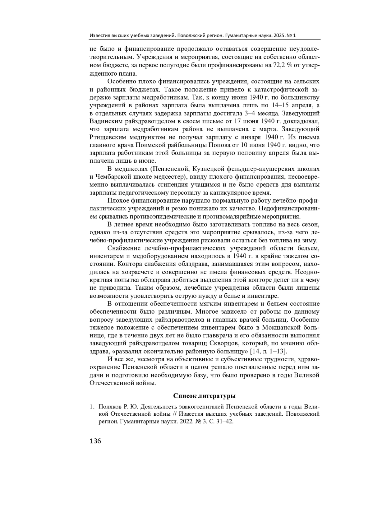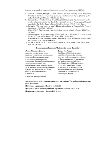 1. Поляков Р. Ю. Деятельность эвакогоспиталей Пензенской области в годы Великой Отечественной войны // Известия высших учебных заведений. Поволжский регион. Гуманитарные науки. 2022. № 3. С. 31-42. EDN: ESCAGO