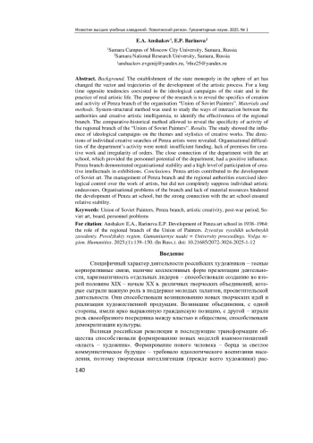 Актуальность и цели. Утверждение государственной монополии в сфере искусства изменило вектор и траектории развития художественного процесса. В идеологических кампаниях государства и практике реальной художественной жизни долгое время сосуществовали противоположные тенденции. Цель исследования - выявить специфику создания и деятельности Пензенского отделения организации «Союз советских художников». Материалы и методы. Системно-структурный метод использован для изучения способов взаимодействия власти и творческой художественной интеллигенции, выявления эффективности деятельности регионального отделения. Сравнительно-исторический метод позволил выявить специфику деятельности регионального отделения Союза советских художников. Результаты. Исследование показало влияние идеологических кампаний на тематику и стилистику творческих работ. Выявлены направления индивидуальных творческих поисков пензенских художников. Отмечены организационные трудности деятельности отделения: недостаточное финансирование, отсутствие помещений для творческой работы и нерегулярность заказов. Положительное влияние оказывала тесная связь отделения с художественным училищем, которое обеспечивало кадровый потенциал отделения. Пензенское отделение демонстрировало организационную стабильность и высокий уровень участия творческой интеллигенции в выставках. Выводы. Пензенские художники внесли вклад в развитие советского искусства. Руководство правления отделения и областные органы власти осуществляли идеологический контроль творчества художников, однако не подавляли полностью индивидуальные художественные поиски. Организационные проблемы отделения и недостаток материальных ресурсов препятствовали развитию пензенской художественной школы, однако сильная связь с художественным училищем обеспечивала относительную стабильность.