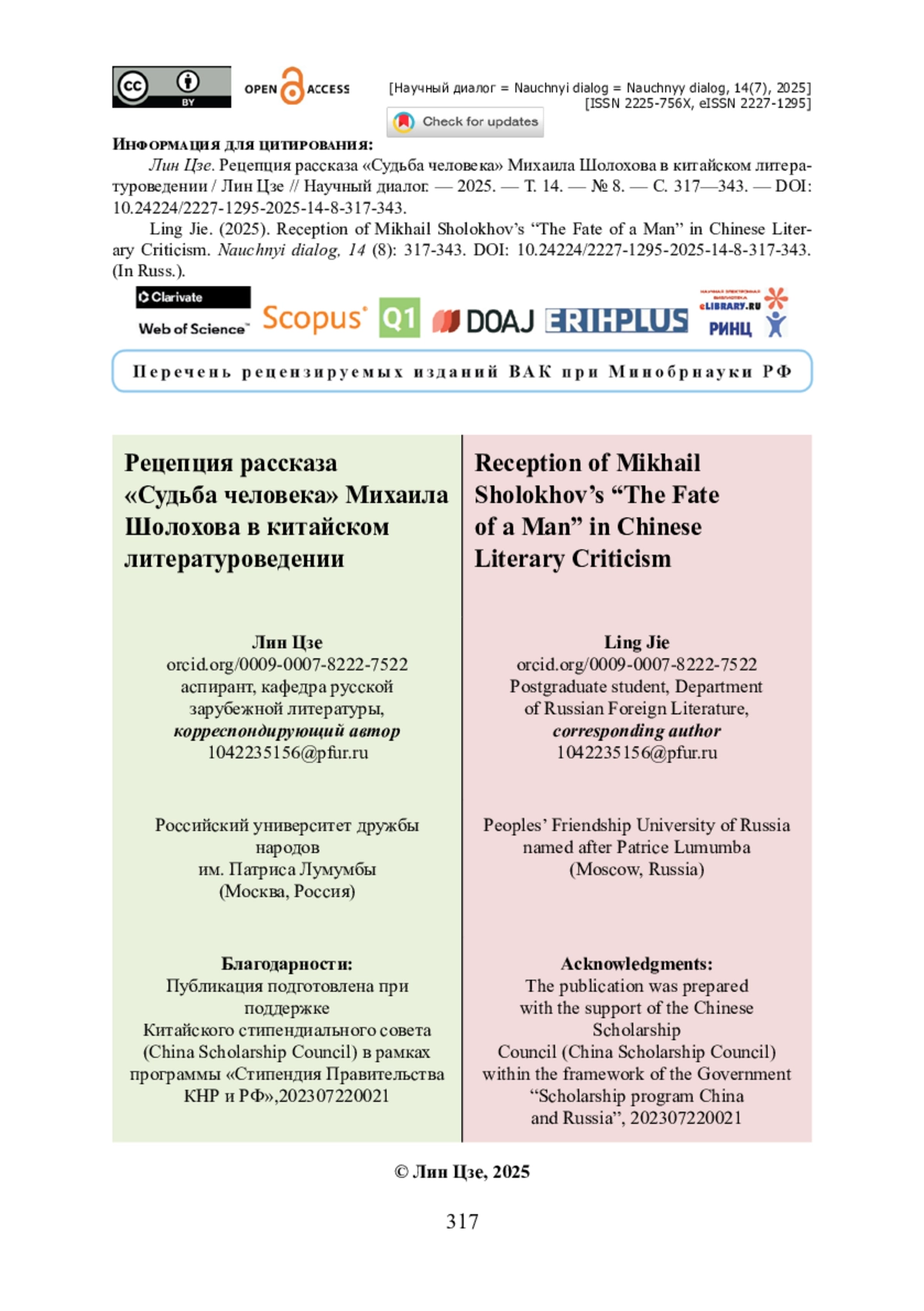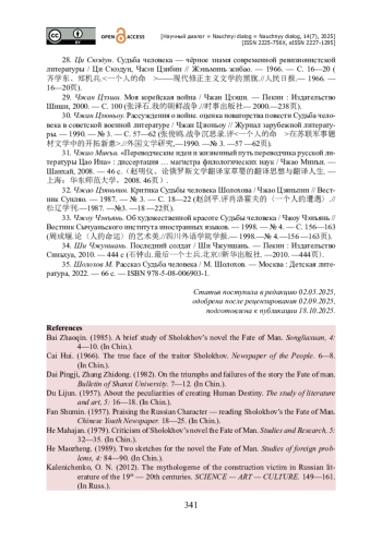 22. Сюй Инь. Судьба человека. ещё одна вершина в творчестве Шолохова / Сюй Инь // Журнал Нанкинского педагогического университета. - 1995. - № 2. - C. 83- 86.许茵.〈人的命运〉.肖洛霍夫创作中又一丰碑.//南京师范大学学报- 1995. -№ 2.- 83-86页).