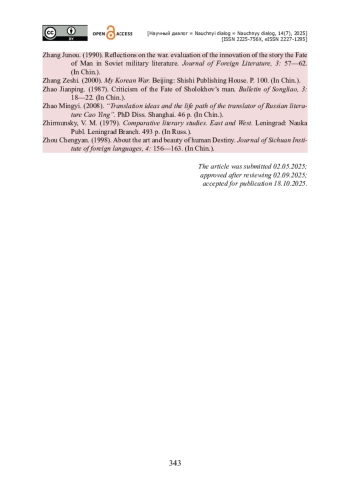 30. Чжан Цзюньоу. Рассуждения о войне. оценка новаторства повести Судьба человека в советской военной литературе / Чжан Цзюньоу // Журнал зарубежной литературы. - 1990. - № 3. - C. 57-62 (张俊鸥.战争沉思录.评<一个人的命运>在苏联军事题材文学中的开拓新意>.//外国文学研究,-1990. -№ 3. -57 -62页).