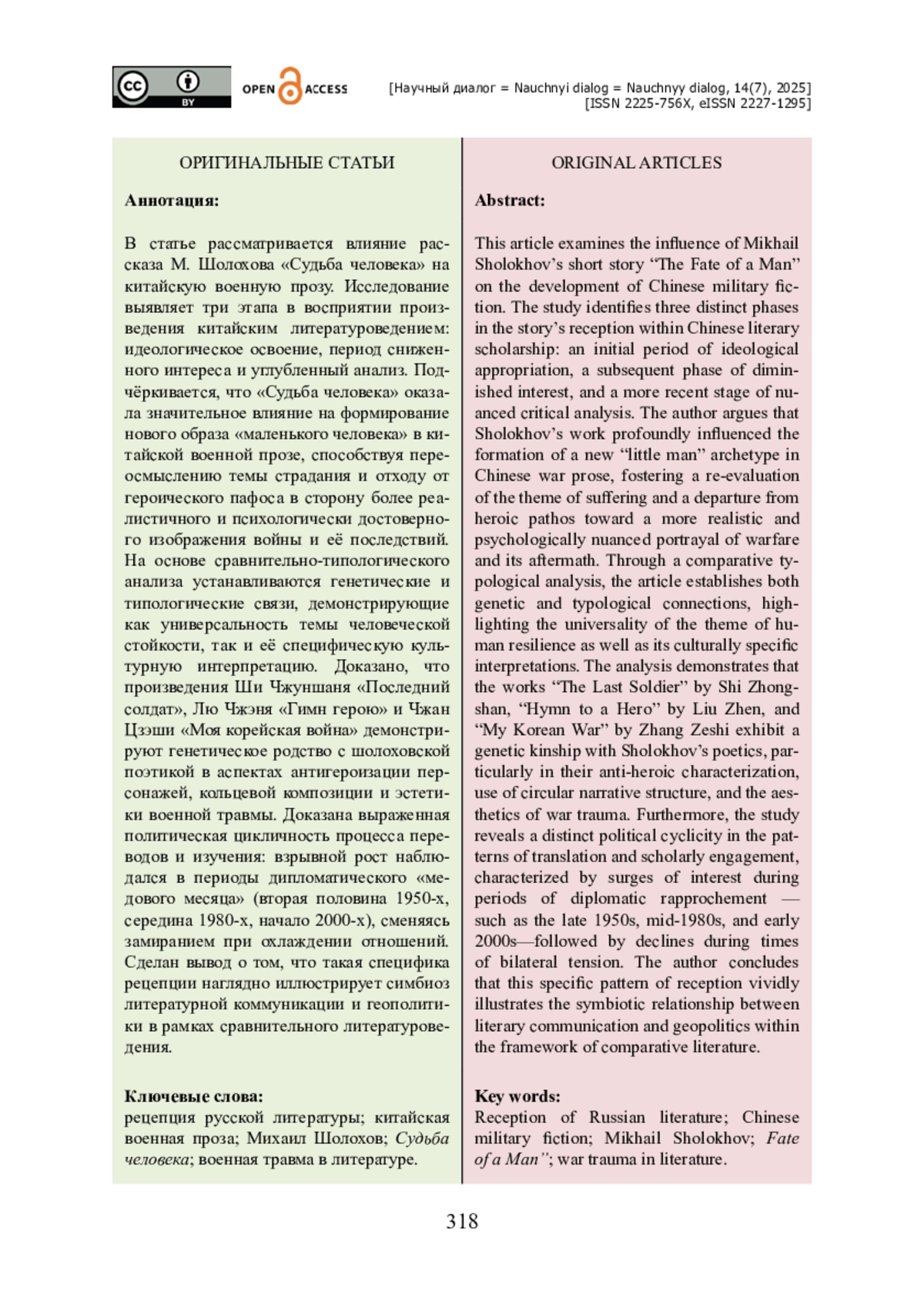 В статье рассматривается влияние рассказа М. Шолохова «Судьба человека» на китайскую военную прозу. Исследование выявляет три этапа в восприятии произведения китайским литературоведением: идеологическое освоение, период сниженного интереса и углубленный анализ. Подчёркивается, что «Судьба человека» оказала значительное влияние на формирование нового образа «маленького человека» в китайской военной прозе, способствуя переосмыслению темы страдания и отходу от героического пафоса в сторону более реалистичного и психологически достоверного изображения войны и её последствий. На основе сравнительно-типологического анализа устанавливаются генетические и типологические связи, демонстрирующие как универсальность темы человеческой стойкости, так и её специфическую культурную интерпретацию. Доказано, что произведения Ши Чжуншаня «Последний солдат», Лю Чжэня «Гимн герою» и Чжан Цзэши «Моя корейская война» демонстрируют генетическое родство с шолоховской поэтикой в аспектах антигероизации персонажей, кольцевой композиции и эстетики военной травмы. Доказана выраженная политическая цикличность процесса переводов и изучения: взрывной рост наблюдался в периоды дипломатического «медового месяца» (вторая половина 1950-х, середина 1980-х, начало 2000-х), сменяясь замиранием при охлаждении отношений. Сделан вывод о том, что такая специфика рецепции наглядно иллюстрирует симбиоз литературной коммуникации и геополитики в рамках сравнительного литературоведения.