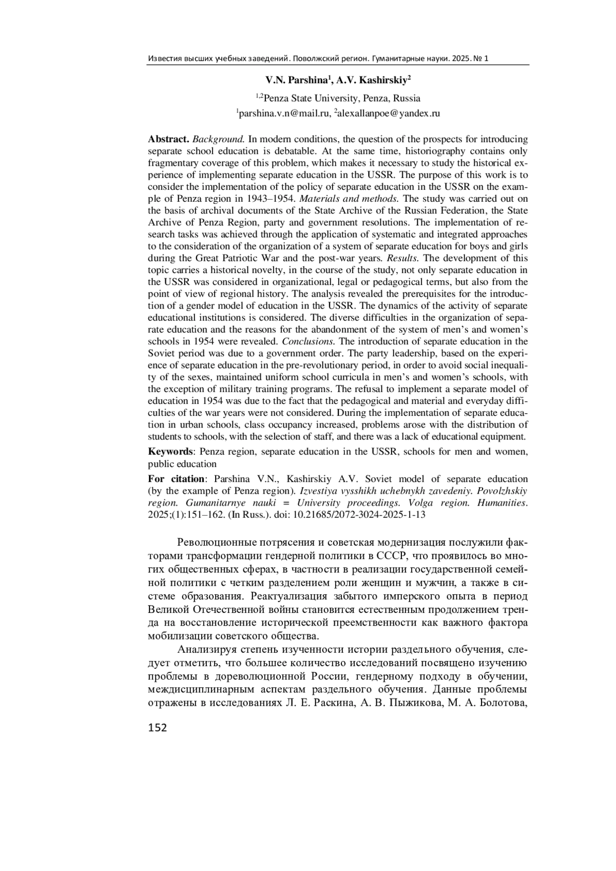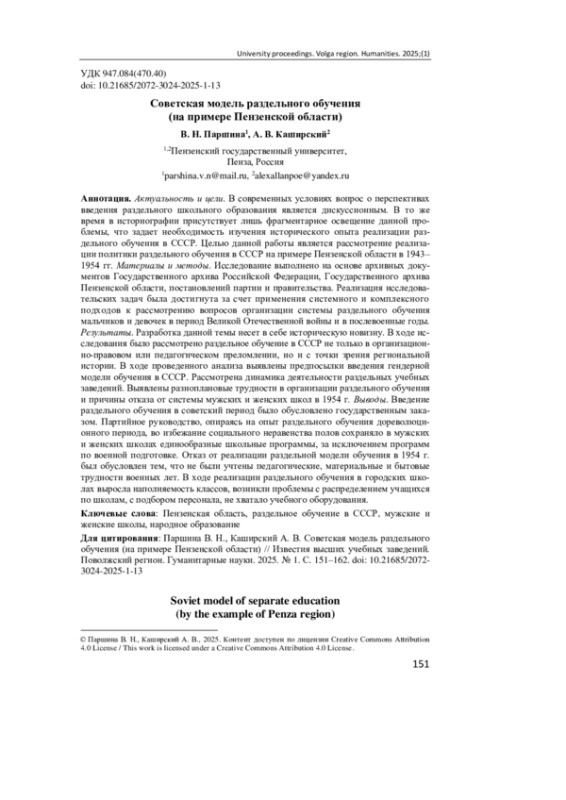 Актуальность и цели. В современных условиях вопрос о перспективах введения раздельного школьного образования является дискуссионным. В то же время в историографии присутствует лишь фрагментарное освещение данной проблемы, что задает необходимость изучения исторического опыта реализации раздельного обучения в СССР. Целью данной работы является рассмотрение реализации политики раздельного обучения в СССР на примере Пензенской области в 1943-1954 гг. Материалы и методы. Исследование выполнено на основе архивных документов Государственного архива Российской Федерации, Государственного архива Пензенской области, постановлений партии и правительства. Реализация исследовательских задач была достигнута за счет применения системного и комплексного подходов к рассмотрению вопросов организации системы раздельного обучения мальчиков и девочек в период Великой Отечественной войны и в послевоенные годы. Результаты. Разработка данной темы несет в себе историческую новизну. В ходе исследования было рассмотрено раздельное обучение в СССР не только в организационно-правовом или педагогическом преломлении, но и с точки зрения региональной истории. В ходе проведенного анализа выявлены предпосылки введения гендерной модели обучения в СССР. Рассмотрена динамика деятельности раздельных учебных заведений. Выявлены разноплановые трудности в организации раздельного обучения и причины отказа от системы мужских и женских школ в 1954 г. Выводы. Введение раздельного обучения в советский период было обусловлено государственным заказом. Партийное руководство, опираясь на опыт раздельного обучения дореволюционного периода, во избежание социального неравенства полов сохраняло в мужских и женских школах единообразные школьные программы, за исключением программ по военной подготовке. Отказ от реализации раздельной модели обучения в 1954 г. был обусловлен тем, что не были учтены педагогические, материальные и бытовые трудности военных лет. В ходе реализации раздельного обучения в городских школах выросла наполняемость классов, возникли проблемы с распределением учащихся по школам, с подбором персонала, не хватало учебного оборудования.