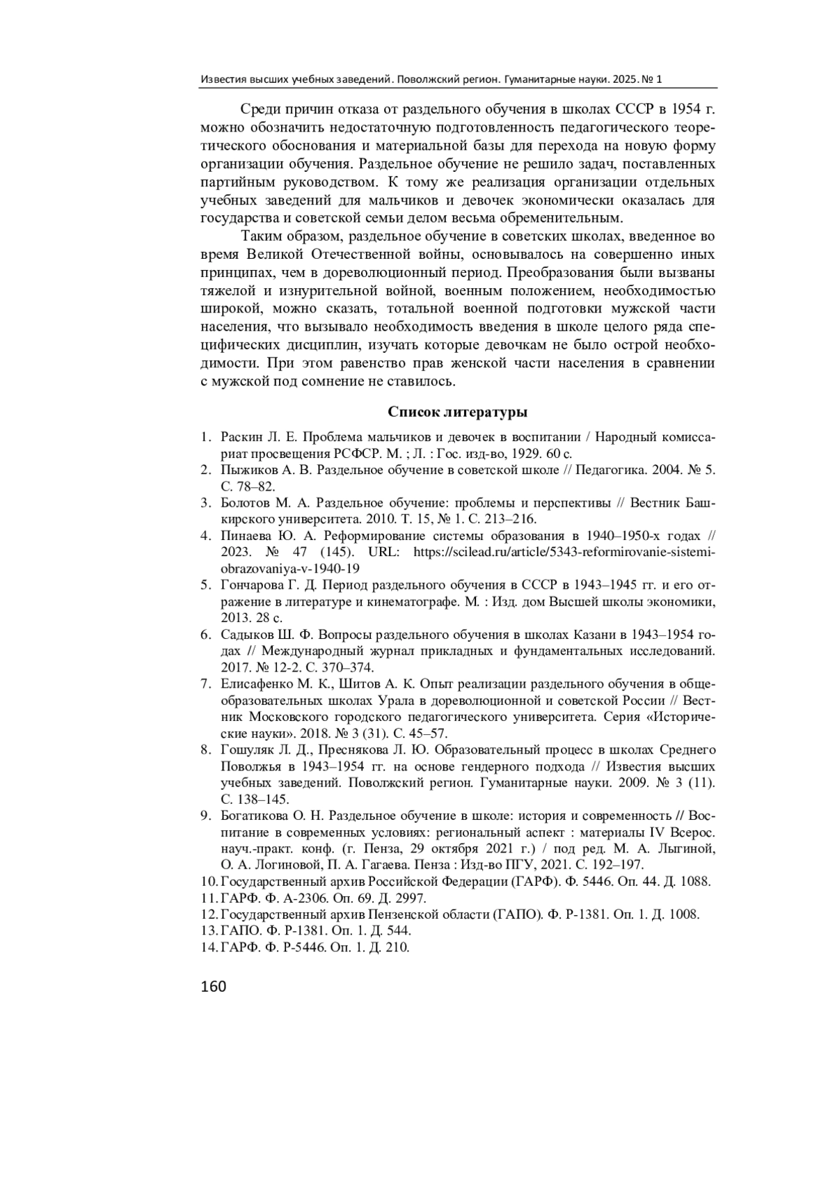 6. Садыков Ш. Ф. Вопросы раздельного обучения в школах Казани в 1943-1954 годах // Международный журнал прикладных и фундаментальных исследований. 2017. № 12-2. С. 370-374. EDN: YMHIBL
