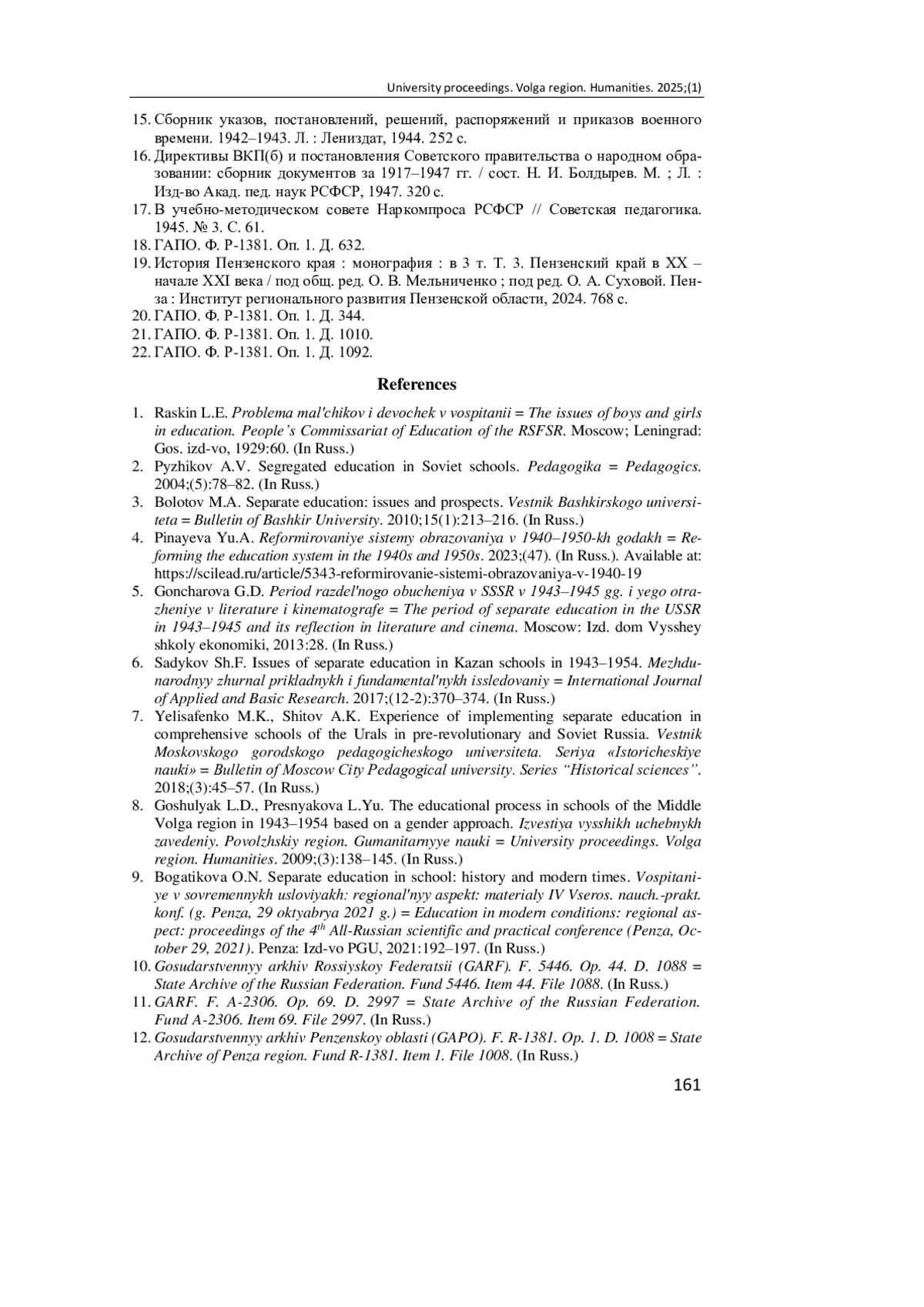 7. Елисафенко М. К., Шитов А. К. Опыт реализации раздельного обучения в общеобразовательных школах Урала в дореволюционной и советской России // Вестник Московского городского педагогического университета. Серия “Исторические науки”. 2018. № 3 (31). С. 45-57.