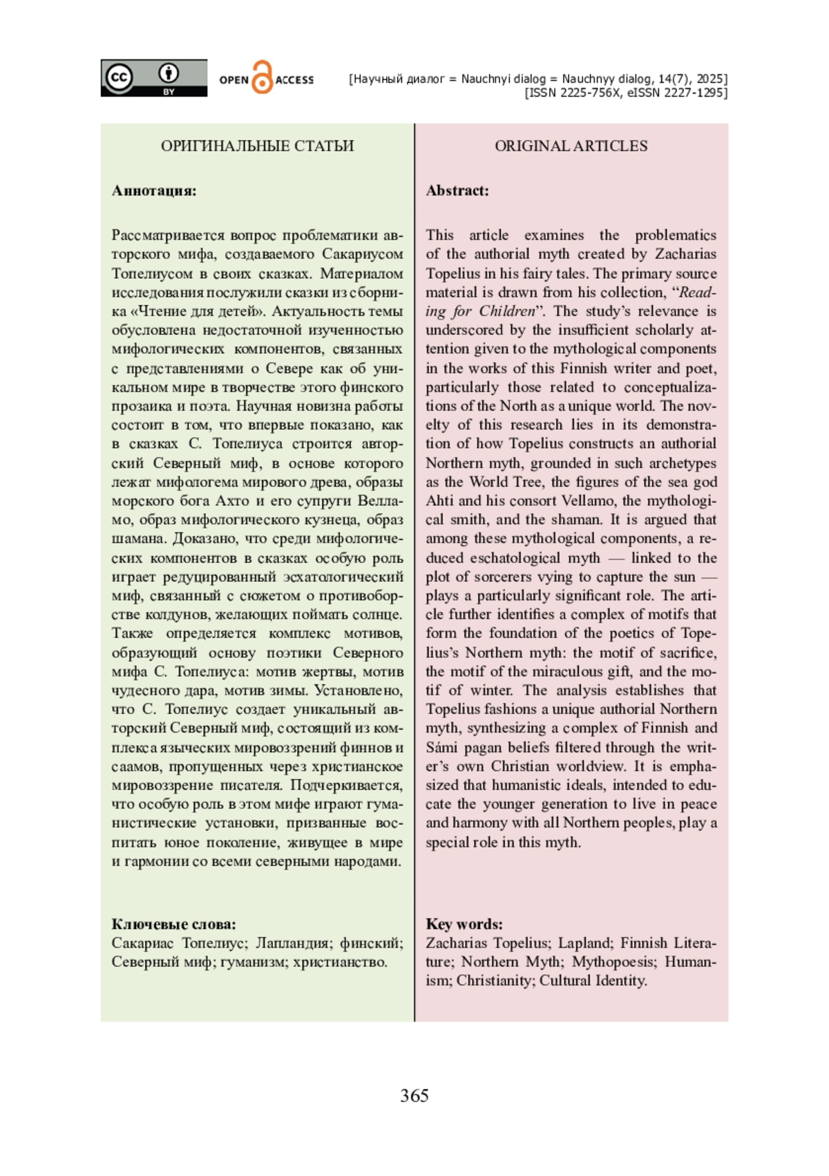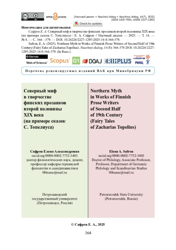 Рассматривается вопрос проблематики авторского мифа, создаваемого Сакариусом Топелиусом в своих сказках. Материалом исследования послужили сказки из сборника «Чтение для детей». Актуальность темы обусловлена недостаточной изученностью мифологических компонентов, связанных с представлениями о Севере как об уникальном мире в творчестве этого финского прозаика и поэта. Научная новизна работы состоит в том, что впервые показано, как в сказках С. Топелиуса строится авторский Северный миф, в основе которого лежат мифологема мирового древа, образы морского бога Ахто и его супруги Велламо, образ мифологического кузнеца, образ шамана. Доказано, что среди мифологических компонентов в сказках особую роль играет редуцированный эсхатологический миф, связанный с сюжетом о противоборстве колдунов, желающих поймать солнце. Также определяется комплекс мотивов, образующий основу поэтики Северного мифа С. Топелиуса: мотив жертвы, мотив чудесного дара, мотив зимы. Установлено, что С. Топелиус создает уникальный авторский Северный миф, состоящий из комплекса языческих мировоззрений финнов и саамов, пропущенных через христианское мировоззрение писателя. Подчеркивается, что особую роль в этом мифе играют гуманистические установки, призванные воспитать юное поколение, живущее в мире и гармонии со всеми северными народами.