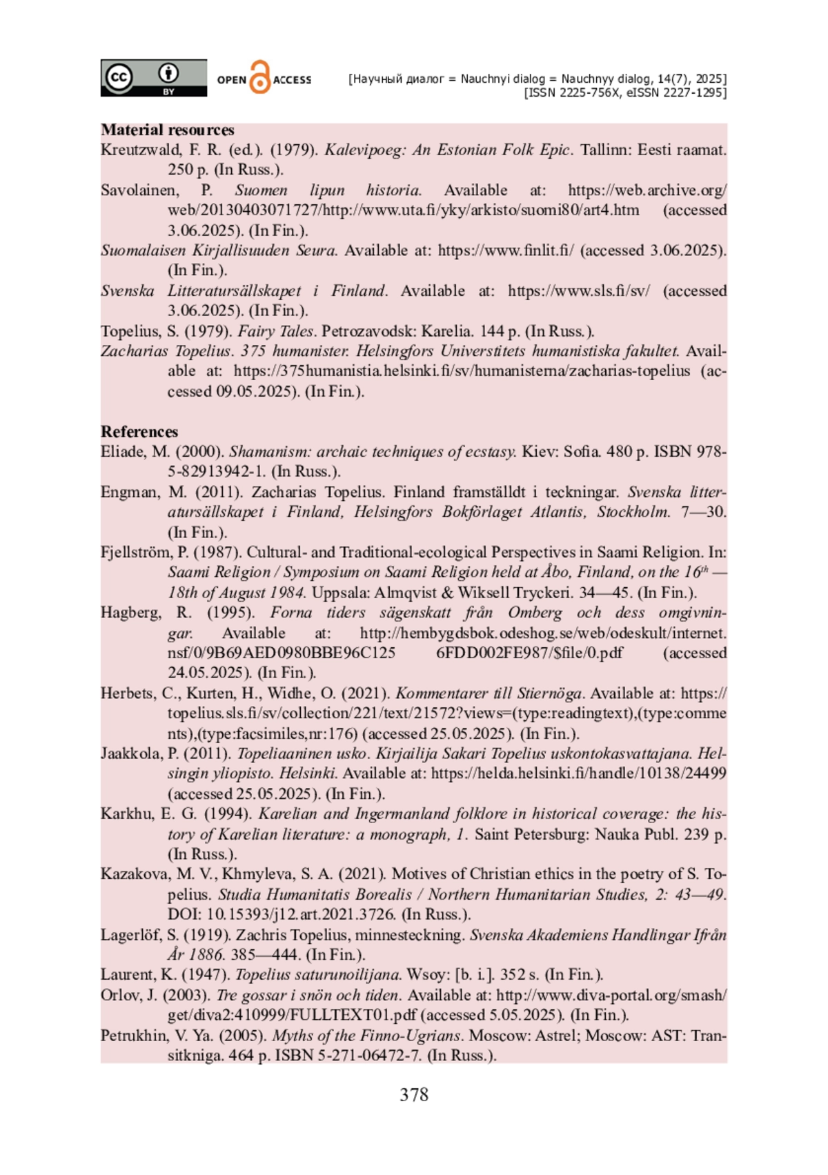 1. Казакова М. В. Мотивы христианской этики в поэзии С. Топелиуса / М. В. Казакова, С. А. Хмылева // Studia Humanitatis Borealis / Северные гуманитарные исследования. - 2021. - № 2. - С. 43-49. - https://doi.org/10.15393/j12.art.2021.3726.