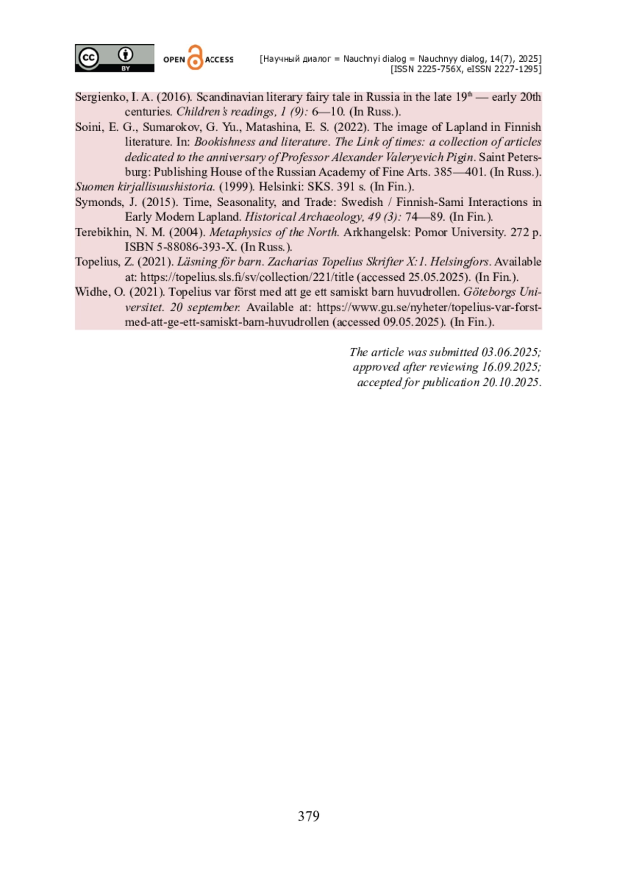16. Symonds J. Time, Seasonality, and Trade : Swedish / Finnish-Sami Interactions in Early Modern Lapland / J. Symonds // Historical Archaeology. - 2015. - Vol. 49. - № 3. - Pp. 74-89.