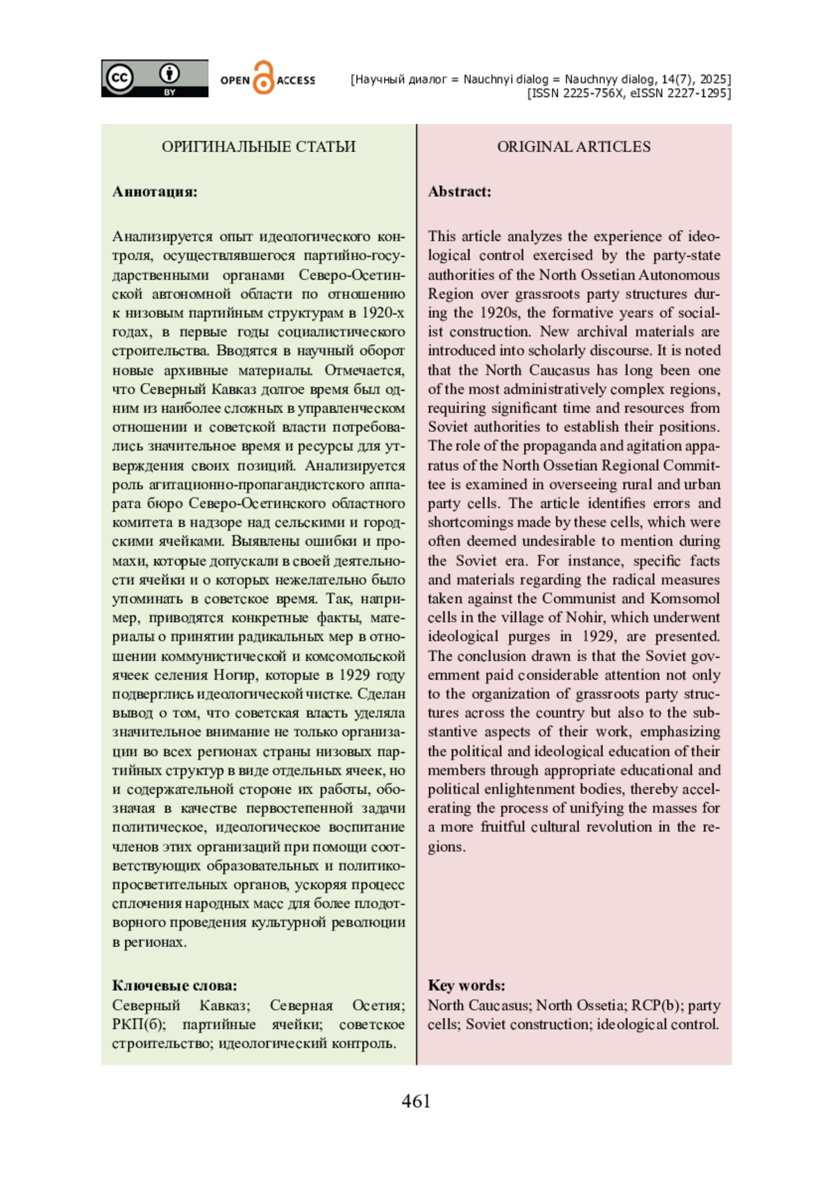 Анализируется опыт идеологического контроля, осуществлявшегося партийно-государственными органами Северо-Осетинской автономной области по отношению к низовым партийным структурам в 1920-х годах, в первые годы социалистического строительства. Вводятся в научный оборот новые архивные материалы. Отмечается, что Северный Кавказ долгое время был одним из наиболее сложных в управленческом отношении и советской власти потребовались значительное время и ресурсы для утверждения своих позиций. Анализируется роль агитационно-пропагандистского аппарата бюро Северо-Осетинского областного комитета в надзоре над сельскими и городскими ячейками. Выявлены ошибки и промахи, которые допускали в своей деятельности ячейки и о которых нежелательно было упоминать в советское время. Так, например, приводятся конкретные факты, материалы о принятии радикальных мер в отношении коммунистической и комсомольской ячеек селения Ногир, которые в 1929 году подверглись идеологической чистке. Сделан вывод о том, что советская власть уделяла значительное внимание не только организации во всех регионах страны низовых партийных структур в виде отдельных ячеек, но и содержательной стороне их работы, обозначая в качестве первостепенной задачи политическое, идеологическое воспитание членов этих организаций при помощи соответствующих образовательных и политикопросветительных органов, ускоряя процесс сплочения народных масс для более плодотворного проведения культурной революции в регионах.