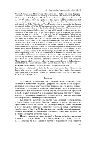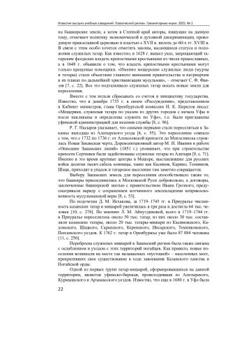 Актуальность и цели. Актуальность исследования обусловлена тем, что во время переписи населения в Башкирии есть тенденция переписывать татарское население Северо-Западных регионов республики Башкортостан в башкир, апеллируя к документам XVIII-XIX вв., где население данных областей могло называться башкирами, но не в этническом, а в сословном значении. Исследование направлено на обобщение информации о деятельности татар-мишарей в Зауралье, об их роли в подавлении башкирских восстаний первой половины ХVIII в. и инкорпорации служилых мишарей в административные органы Оренбургской пограничной комиссии. Материалы и методы. Применялся проблемно-хронологический подход, который позволил проанализировать различные аспекты социальной политики Российской империи в динамике социально-политических изменений, произошедших в конце ХVII - первой половине XVIII в. в Волго-Уральском регионе, а также историко-генетический метод, позволивший рассмотреть исторические факты и раскрыть причины и факторы, влиявшие на социальное развитие татар-мишарей в Волго-Уральском регионе. Теоретико-методологической основой исследования стали концептуальные положения научных исследований в области изучения этно-конфессиональной политики Российского государства на национальных окраинах империи. Результаты. На основе изученных законодательных источников и литературы раскрыт процесс инкорпорации татар-мишарей в российскую государственную службу в качестве военно-служилого сословия, в частности в качестве казаков, ахунов в башкирские даруги, полковые муллы в башкиро-мещерякское войско, а также в администрацию Оренбургской пограничной комиссии в качестве переводчиков, толмачей, конфидентов. Выводы. Роль служилых татар из числа мишарей многофункциональна. С одной стороны, они выполняли военно-полицейскую функцию. С другой стороны, толмачи, переводчики, письмоводители из числа татар-мишарей сыграли огромную положительную роль в управлении и изучении Востока, способствуя тем самым безболезненной интеграции казахской степи в общероссийское пространство.