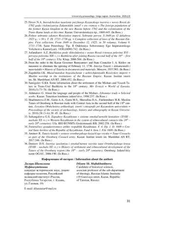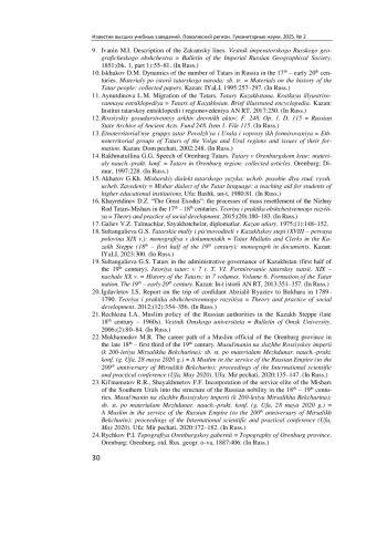 22. Мухамедов М. Р. Карьерный путь мусульманского чиновника Оренбургской губернии в конце XVIII - первой трети XIX в. // Мусульманин на службе Российской империи (к 200-летию Мирсалиха Бекчурина): сб. ст. по материалам Междунар. науч.-практ. конф. (г. Уфа, 28 мая 2020 г.). Уфа: Мир печати, 2020. С. 135-147.