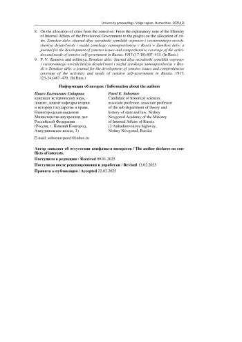 8. О выделении городов из состава земств: Из объяснительной записки МВД Временного правительства к проекту о выделении городов // Земское дело: журнал для разработки земских вопросов и всестороннего освещения деятельности и нужд земского самоуправления в России. 1917. № 17-18. С. 407-413.