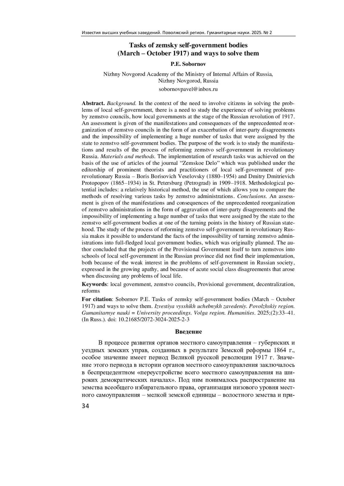 Актуальность и цели. В условиях необходимости вовлечения граждан в решение проблем местного самоуправления возникает необходимость изучения опыта разрешения задач земскими управами как органами местного самоуправления на этапе российской революции 1917 г. Дается оценка проявлений и последствий невиданной реорганизации земских управ в виде обострения межпартийных разногласий и невозможности реализации огромного количества задач, которые были возложены государством на органы земского самоуправления. Цель работы - изучение проявлений и результатов процесса реформирования земского самоуправления в революционной России. Материалы и методы. Реализация исследовательских задач была достигнута на основе использования статей журнала «Земское дело», который выпускался под редакцией выдающихся теоретиков и практиков местного самоуправления дореволюционной России - Бориса Борисовича Веселовского (1880-1954) и Дмитрия Дмитриевича Протопопова (1865-1934) в Санкт-Петербурге (Петрограде) в 1909-1918 гг. Методологический потенциал включает сравнительно исторический метод, применение которого позволяет сопоставить способы разрешения земскими управами различных задач. Результаты. Дана оценка проявлений и последствий невиданной реорганизации земских управ в виде обострения межпартийных разногласий и невозможности реализации огромного количества задач, которые были возложены государством на органы земского самоуправления на одном из переломных этапов в истории российской государственности. Выводы. Изучение процесса реформирования земского самоуправления в революционной России позволяет уяснить факты невозможности превращения земских управ в полноценные органы государственной власти на местах, что изначально планировалось. Автор пришел к заключению о том, что проекты самого Временного правительства по превращению земств в школы местного самоуправления в российской провинции не нашли своей реализации как по причине слабого интереса к проблемам самоуправления в российском обществе, выраженного в нараставшей апатии, так и по причине острых социально-классовых разногласий, возникавших при обсуждении любых проблем местной жизни.