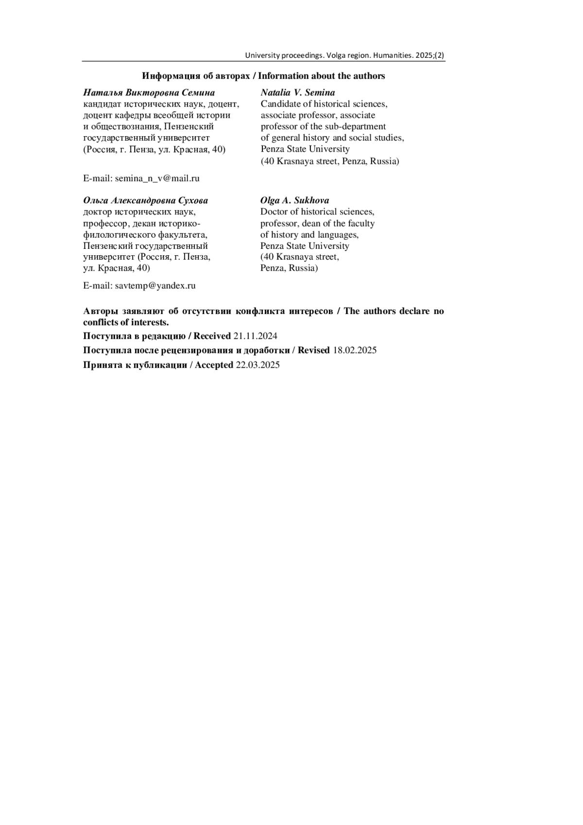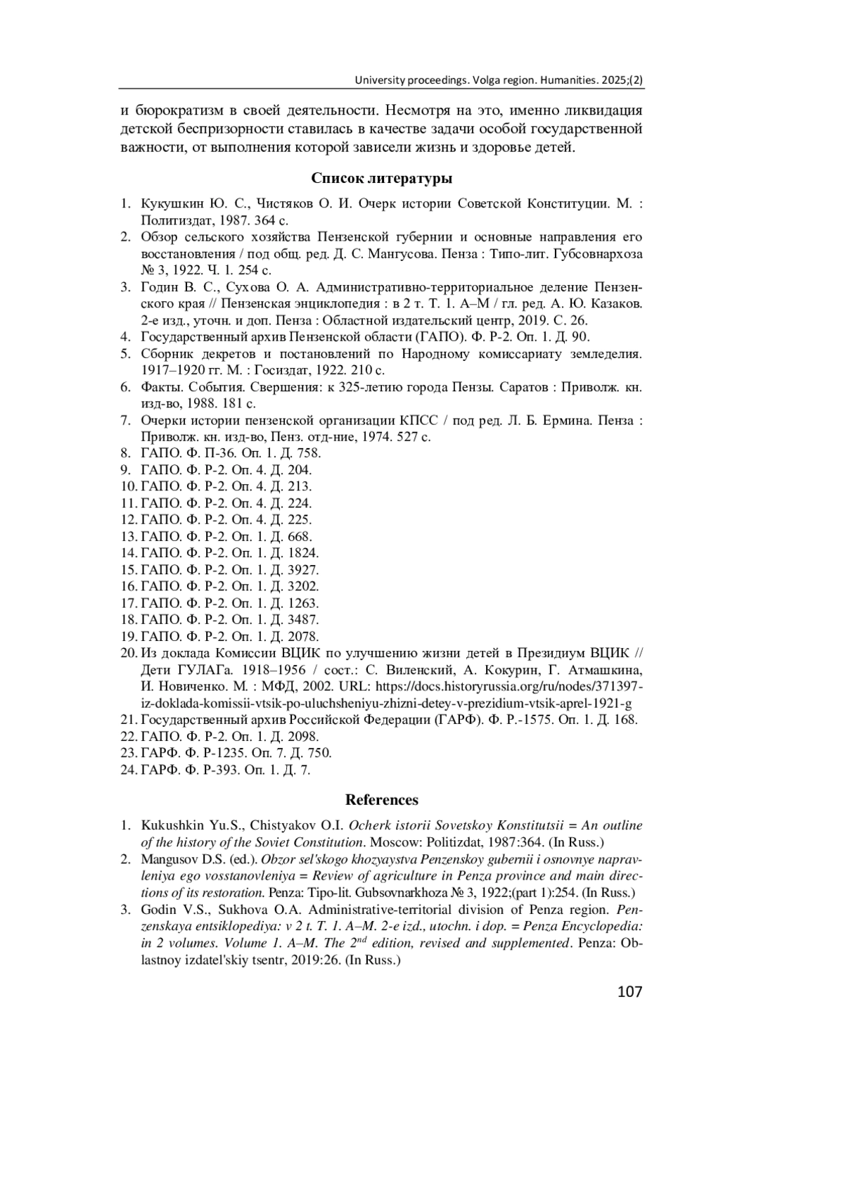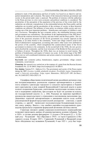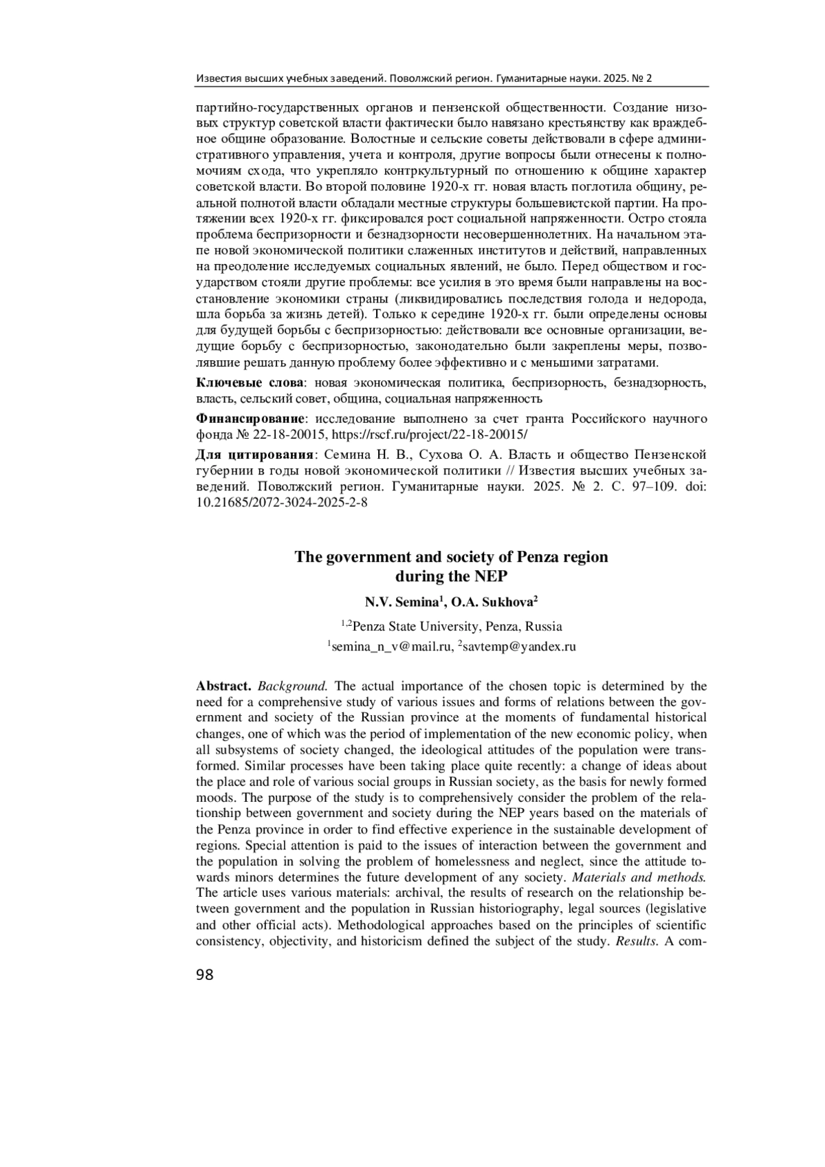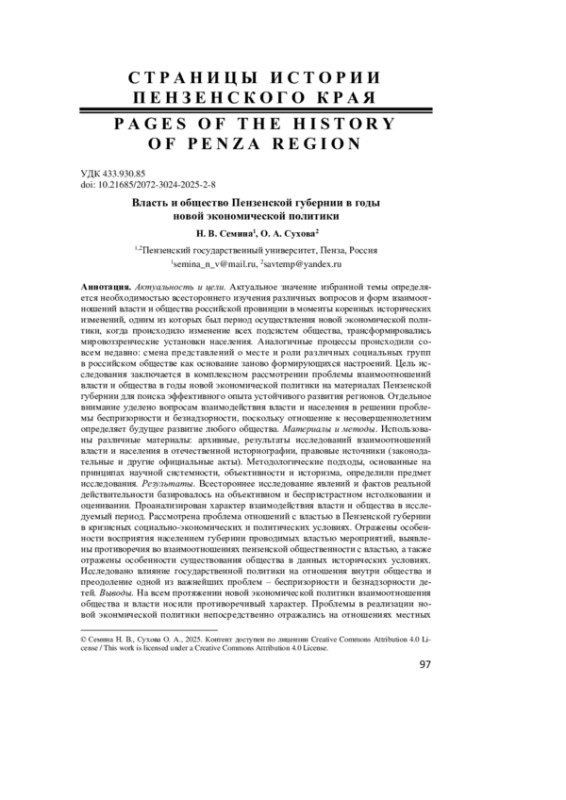 Актуальность и цели. Актуальное значение избранной темы определяется необходимостью всестороннего изучения различных вопросов и форм взаимоотношений власти и общества российской провинции в моменты коренных исторических изменений, одним из которых был период осуществления новой экономической политики, когда происходило изменение всех подсистем общества, трансформировались мировоззренческие установки населения. Аналогичные процессы происходили совсем недавно: смена представлений о месте и роли различных социальных групп в российском обществе как основание заново формирующихся настроений. Цель исследования заключается в комплексном рассмотрении проблемы взаимоотношений власти и общества в годы новой экономической политики на материалах Пензенской губернии для поиска эффективного опыта устойчивого развития регионов. Отдельное внимание уделено вопросам взаимодействия власти и населения в решении проблемы беспризорности и безнадзорности, поскольку отношение к несовершеннолетним определяет будущее развитие любого общества. Материалы и методы. Использованы различные материалы: архивные, результаты исследований взаимоотношений власти и населения в отечественной историографии, правовые источники (законодательные и другие официальные акты). Методологические подходы, основанные на принципах научной системности, объективности и историзма, определили предмет исследования. Результаты. Всестороннее исследование явлений и фактов реальной действительности базировалось на объективном и беспристрастном истолковании и оценивании. Проанализирован характер взаимодействия власти и общества в исследуемый период. Рассмотрена проблема отношений с властью в Пензенской губернии в кризисных социально-экономических и политических условиях. Отражены особенности восприятия населением губернии проводимых властью мероприятий, выявлены противоречия во взаимоотношениях пензенской общественности с властью, а также отражены особенности существования общества в данных исторических условиях. Исследовано влияние государственной политики на отношения внутри общества и преодоление одной из важнейших проблем - беспризорности и безнадзорности детей. Выводы. На всем протяжении новой экономической политики взаимоотношения общества и власти носили противоречивый характер. Проблемы в реализации новой эконмической политики непосредственно отражались на отношениях местных партийно-государственных органов и пензенской общественности. Создание низовых структур советской власти фактически было навязано крестьянству как враждебное общине образование. Волостные и сельские советы действовали в сфере административного управления, учета и контроля, другие вопросы были отнесены к полномочиям схода, что укрепляло контркультурный по отношению к общине характер советской власти. Во второй половине 1920-х гг. новая власть поглотила общину, реальной полнотой власти обладали местные структуры большевистской партии. На протяжении всех 1920-х гг. фиксировался рост социальной напряженности. Остро стояла проблема беспризорности и безнадзорности несовершеннолетних. На начальном этапе новой экономической политики слаженных институтов и действий, направленных на преодоление исследуемых социальных явлений, не было. Перед общ