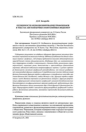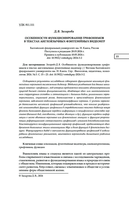 Освещаются результаты исследования совокупного функционала номинаций фэнтезийных персонажей англоязычных видеоигр. Вводится релевантное для данных номинаций понятие «грифоним», под которым предлагается понимать квазиантропонимы существ высшей степени фикциональности, обладающие одно- или многокомпонентным структурным составом и соотносящиеся с внешним видом, уникальными характеристиками, социальной ролью, деятельностью и происхождением фэнтезийного персонажа, наделенного отдельными антропоморфными чертами. С учетом характера деятельности носителей грифонимов устанавливается, что помимо универсальной номинативной функции грифонимы в сопроводительных текстах видеоигр жанра фэнтези выполняют функцию передачи информации о специфических качествах персонажа (внешний вид, способности, стадия эволюции и др.), функцию передачи информации о месте обитания персонажа или фэнтезийных локациях и функцию репрезентации референциальной соотнесенности грифонимов с реальной действительностью. Констатируется полифункциональный характер грифонимов, предполагающий одновременное выполнение этими номинациями двух и более функций в фэнтезийном дискурсе. Формулируется вывод о значимости функционирования грифонимов в моделировании фэнтезийных реальностей, намечаются перспективы дальнейшего развития исследования