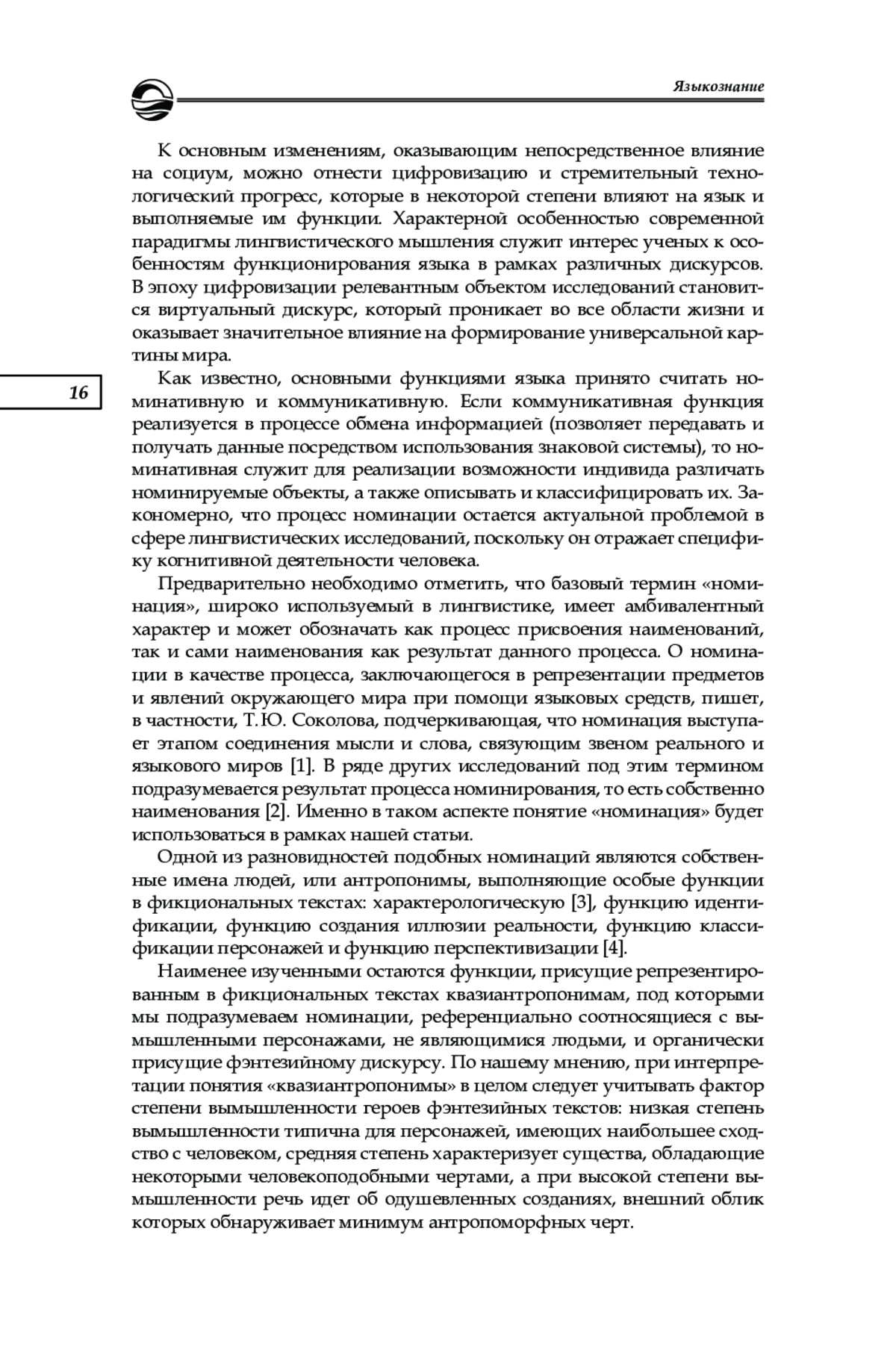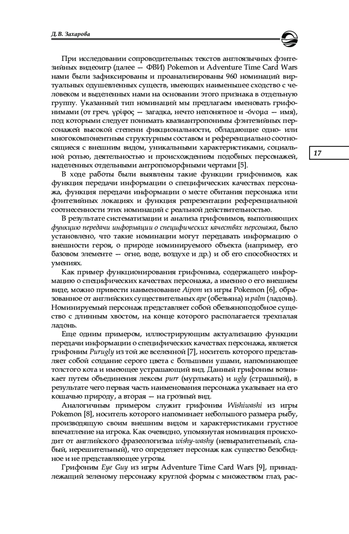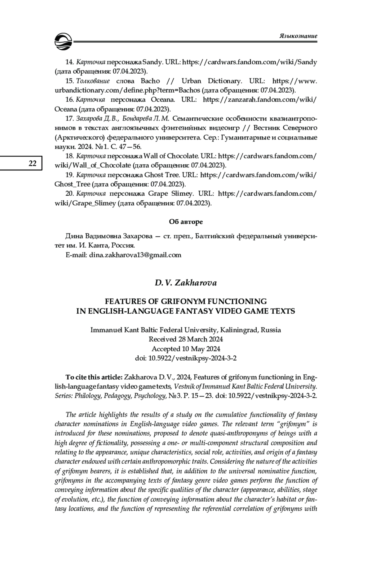 17. Захарова, Д. В. Семантические особенности квазиантропонимов в текстах англоязычных фэнтезийных видеоигр / Д. В. Захарова, Л. М. Бондарева // Вестник Северного (Арктического) федерального университета. Серия: Гуманитарные и социальные науки. - 2024. - Т. 24, № 1. - С. 47-55. DOI: 10.37482/2687-1505-V320 EDN: DLXFVH