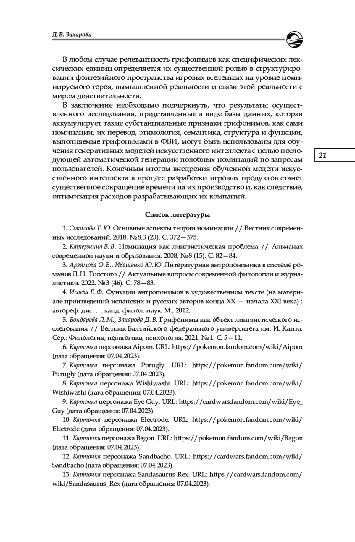 5. Бондарева Л. М., Захарова Д. В. Грифонимы как объект лингвистического исследования // Вестник Балтийского федерального университета им. И. Канта. Сер.: Филология, педагогика, психология. 2021. № 1. С. 5-11. EDN: EZAPZQ